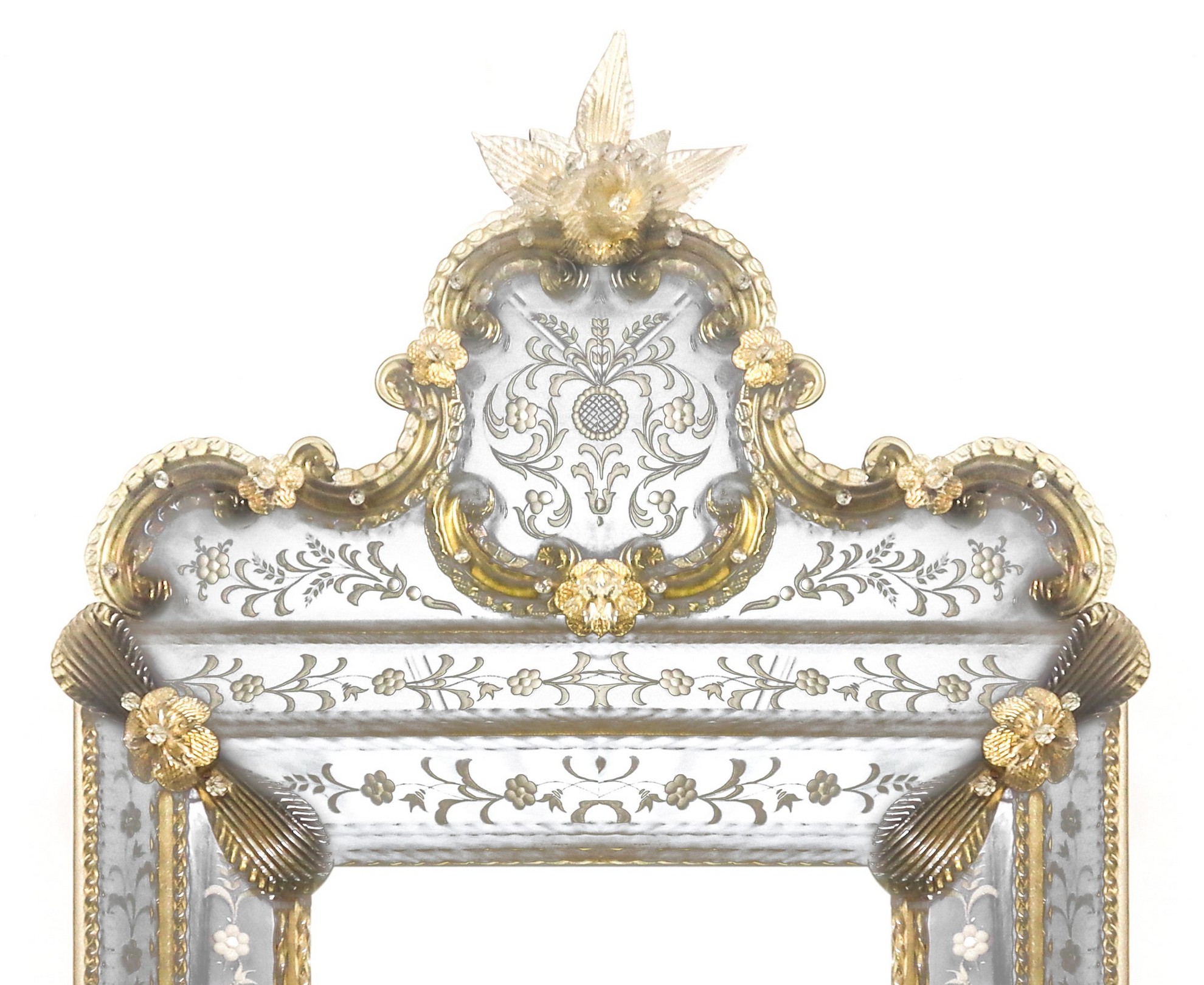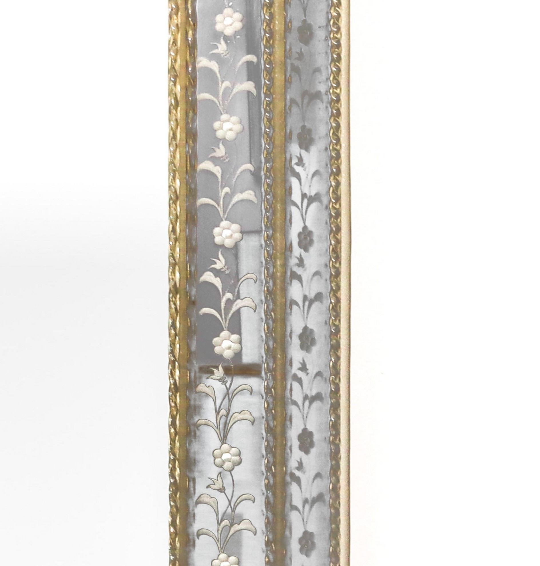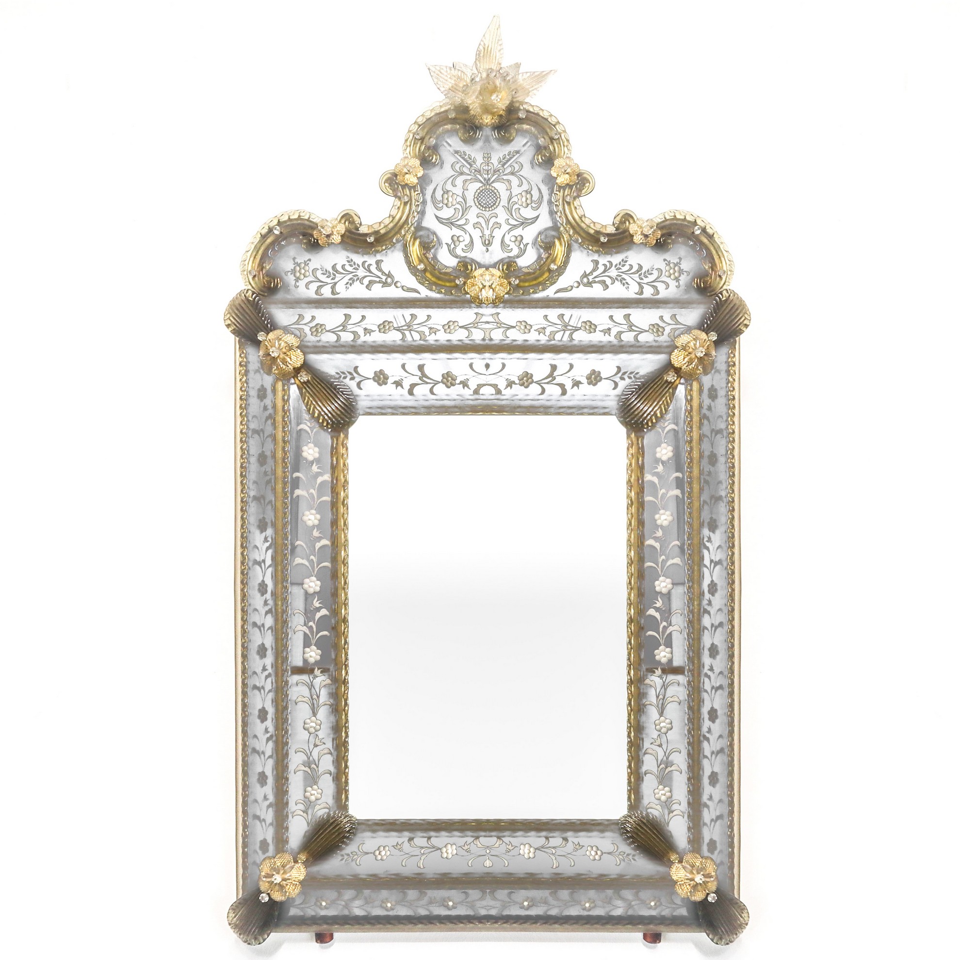 Specchiera di Murano, Primi 20° Secolo h cm 102 x 60 In vetro molato e bulinato a motivi floreali su fondo nero.In vetro molato e bulinato a motivi floreali su fondo nero.