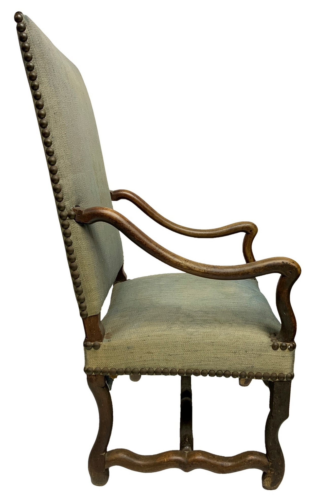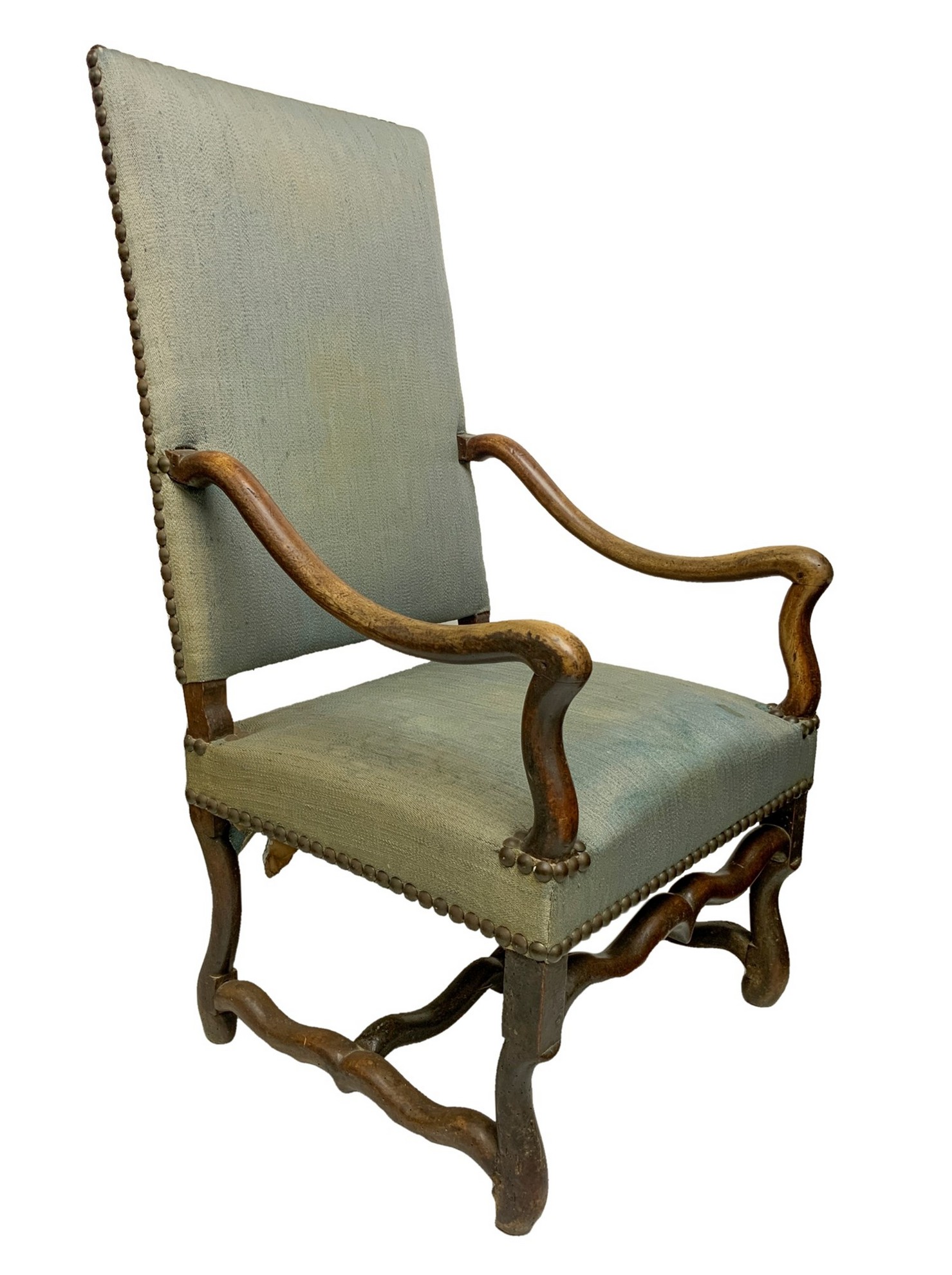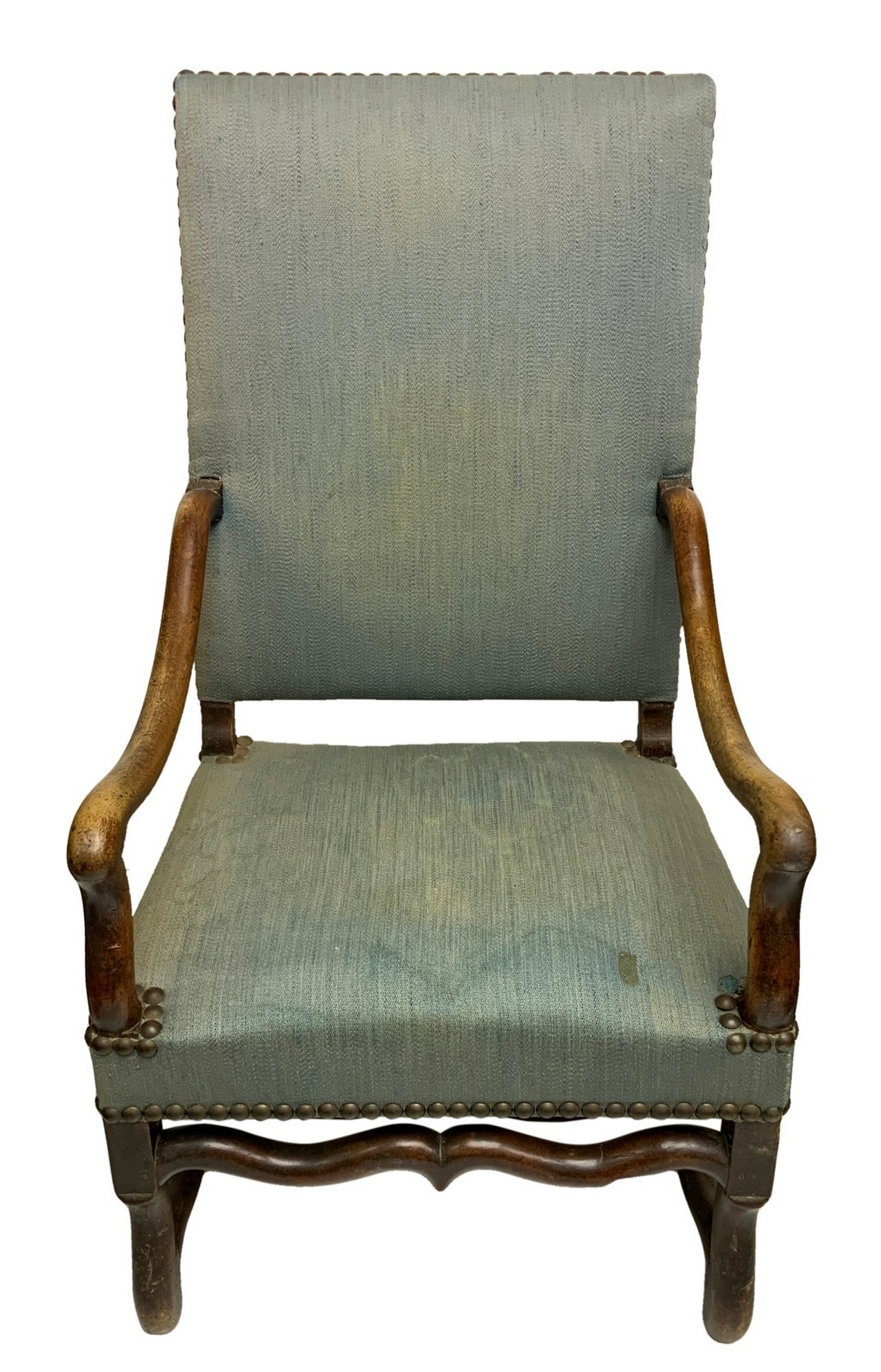 Poltrona in legno di noce., XVIII Secolo. Cm 113x60x67 Con schienale a cartella rettangolare, braccioli mossi e gambe sinuose raccordate da traverse. Segni d'uso sulla tapezzeria.Con schienale a cartella rettangolare, braccioli mossi e gambe sinuose raccordate da traverse. Segni d'uso sulla tapezzeria.