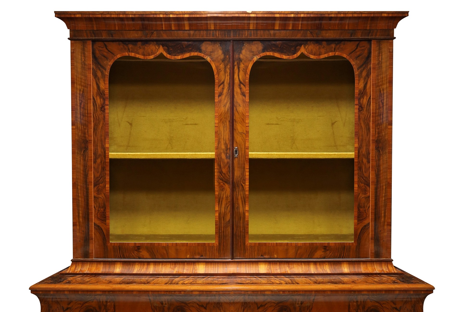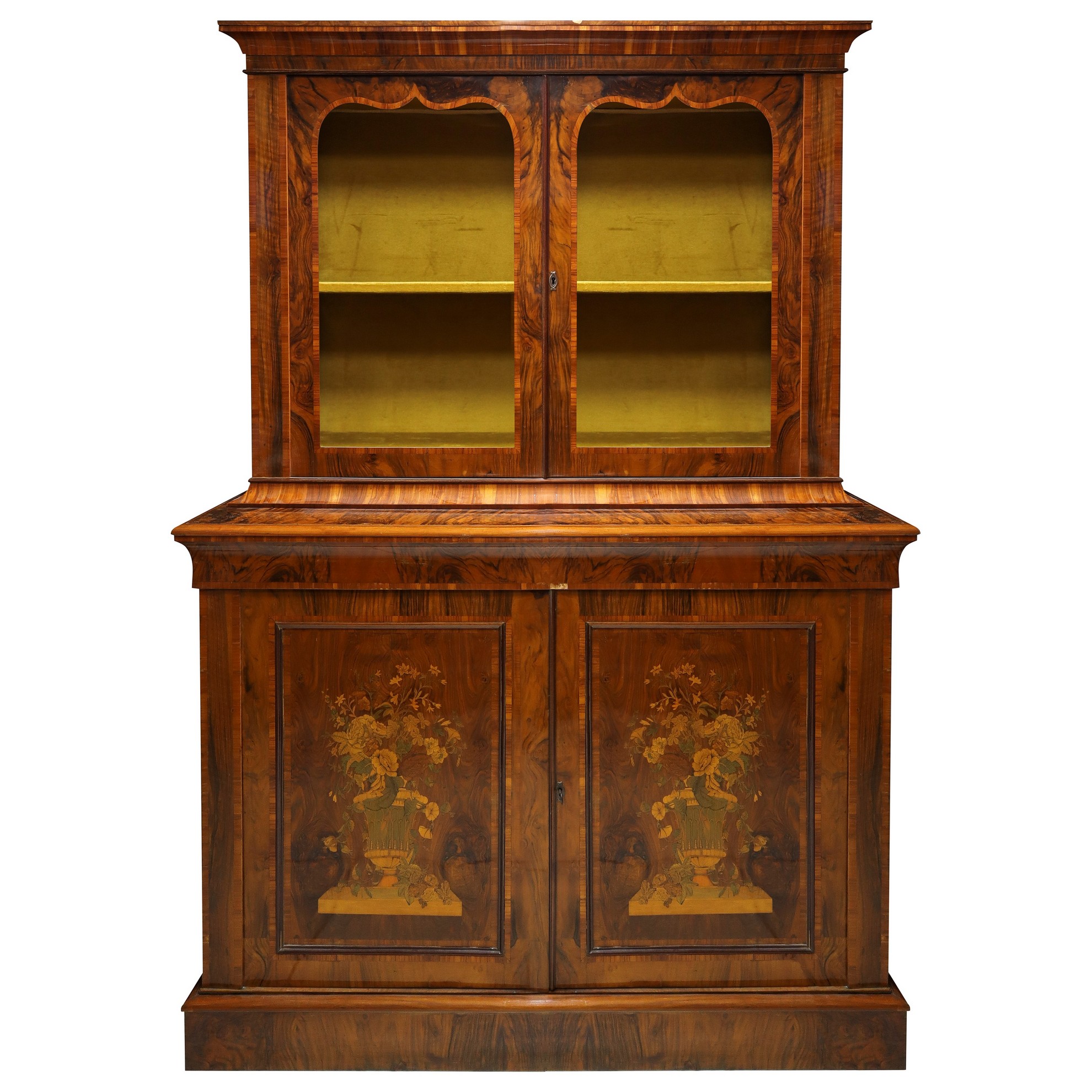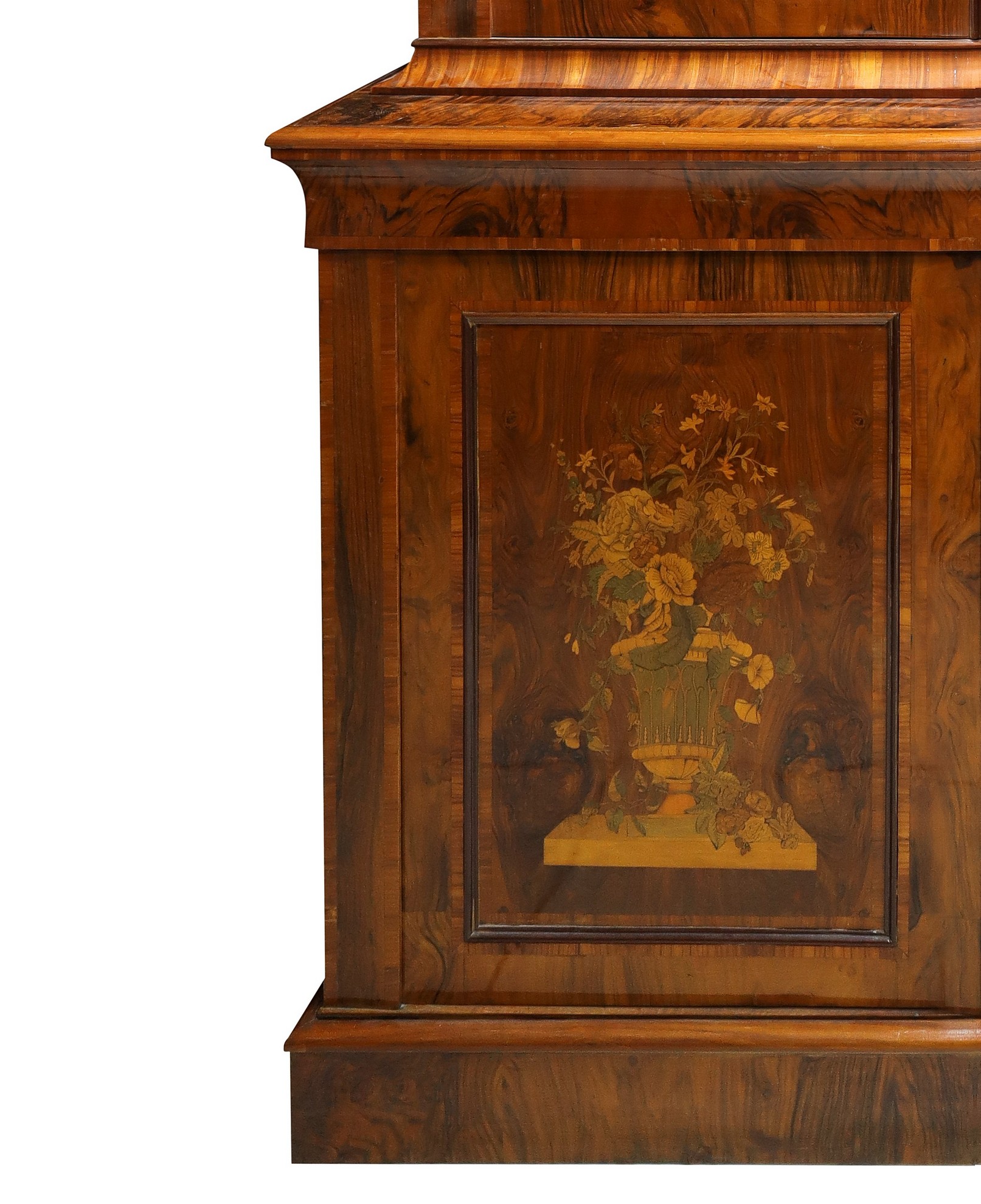 Mobile vetrina a due corpi, 19° Secolo h cm 205 x 140 x 55 Base con sportelli in legno intarsiato con motivo floreale. Base con sportelli in legno intarsiato con motivo floreale.