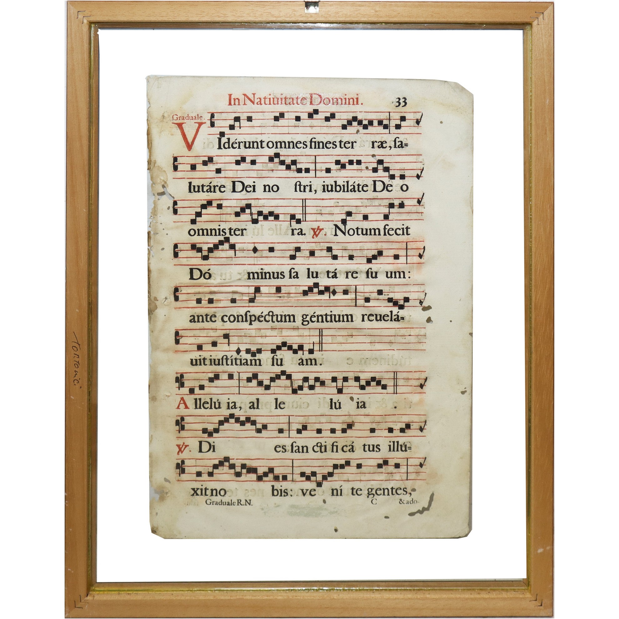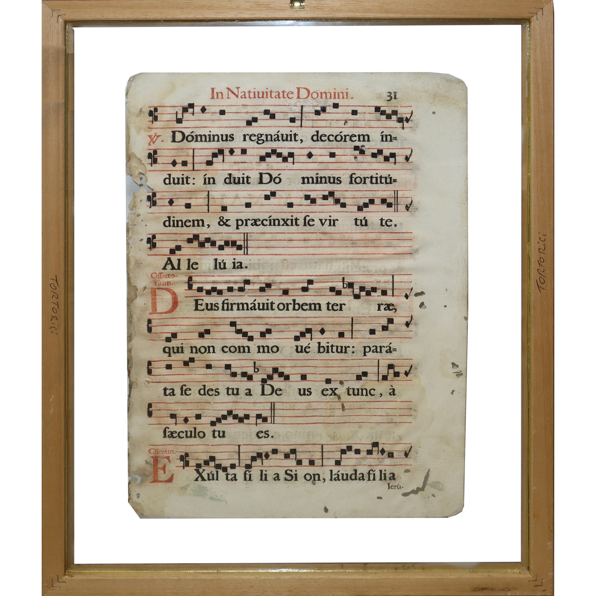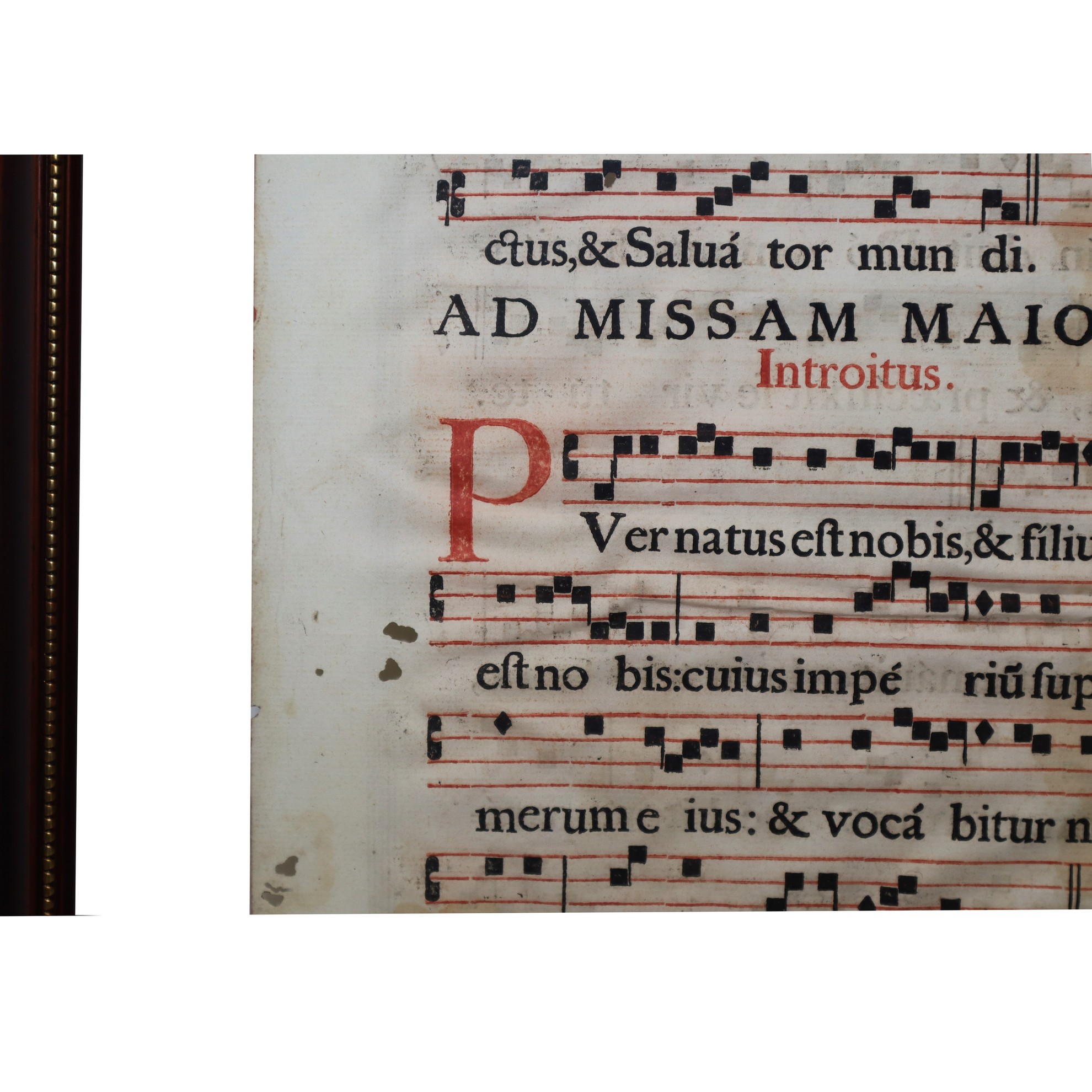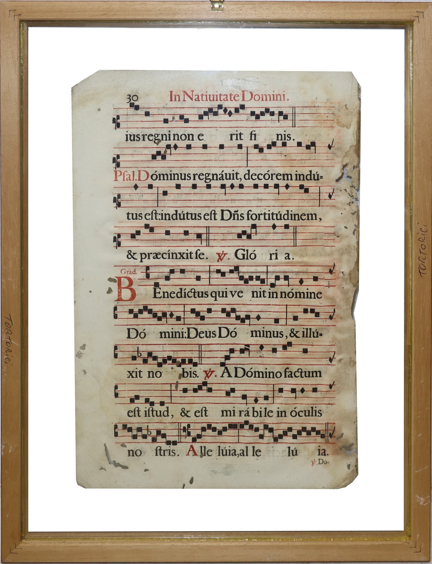 N. 4 Antifonari musica sacra "In Nativitate Domini", XVI Secolo in folio mm 420 x 280, in cornice cm 56 x 43 Tetragramma in inchiostro rubinio, rubricatura e capilettera in rosso. Notazione quadrata. EsemplatTetragramma in inchiostro rubinio, rubricatura e capilettera in rosso. Notazione quadrata. Esemplat
