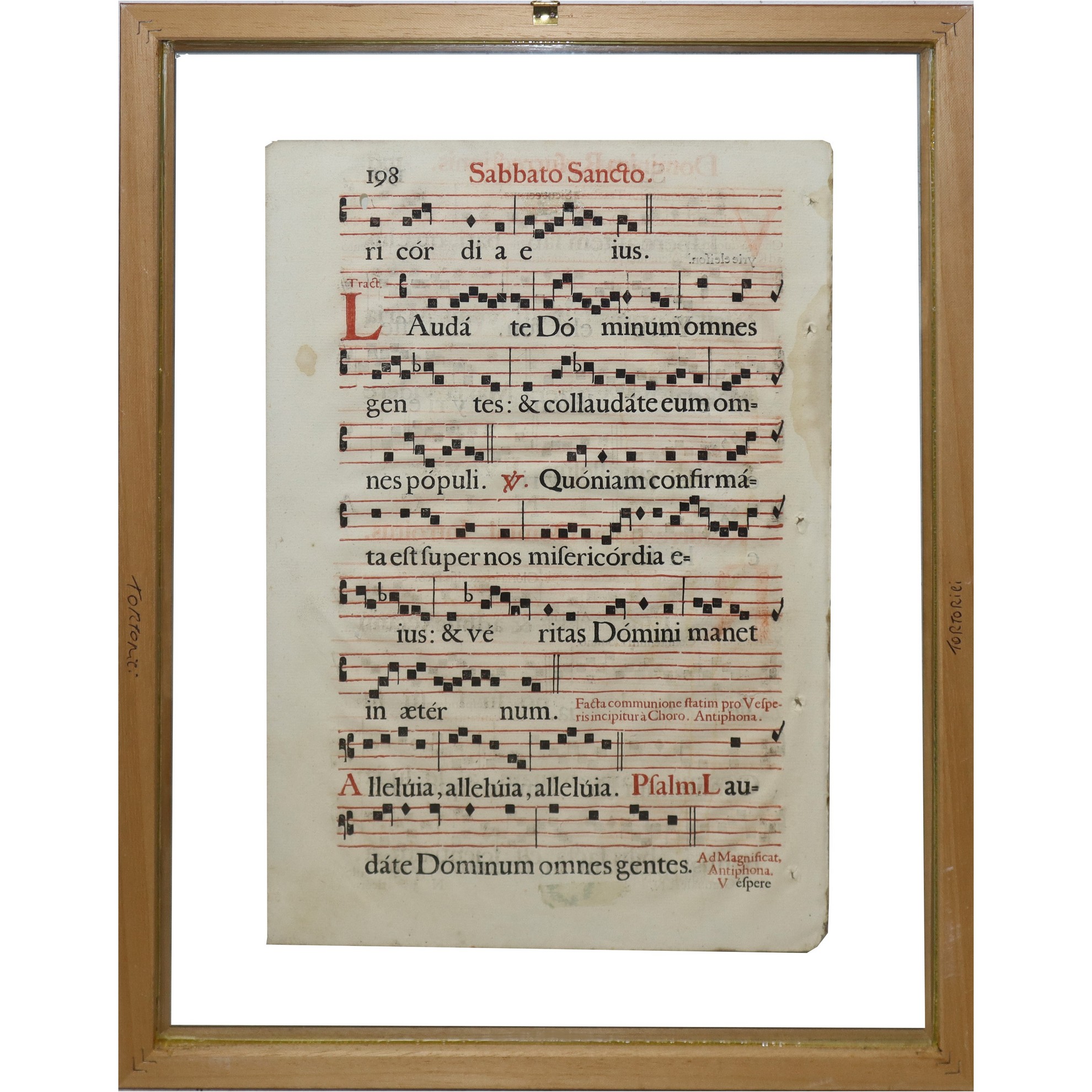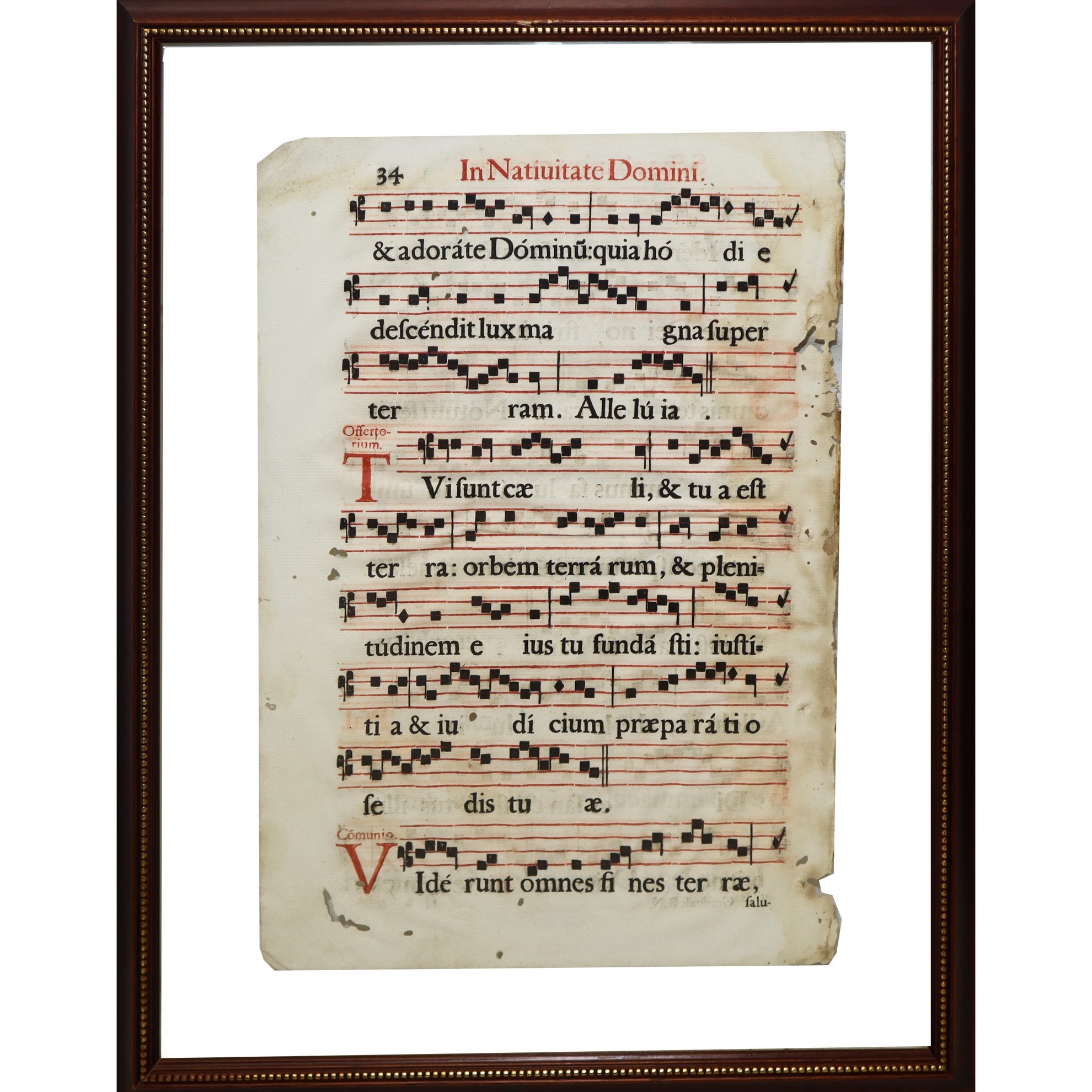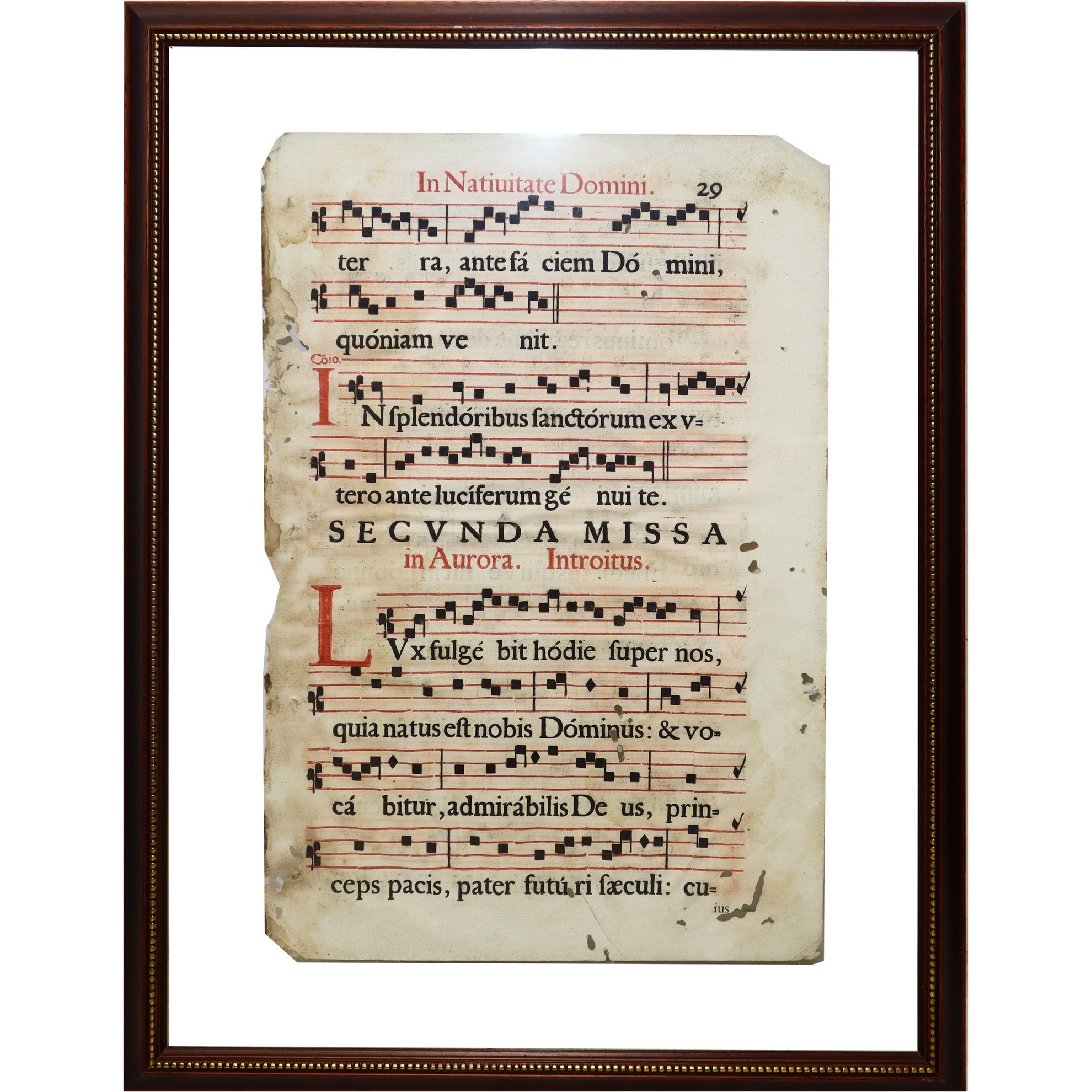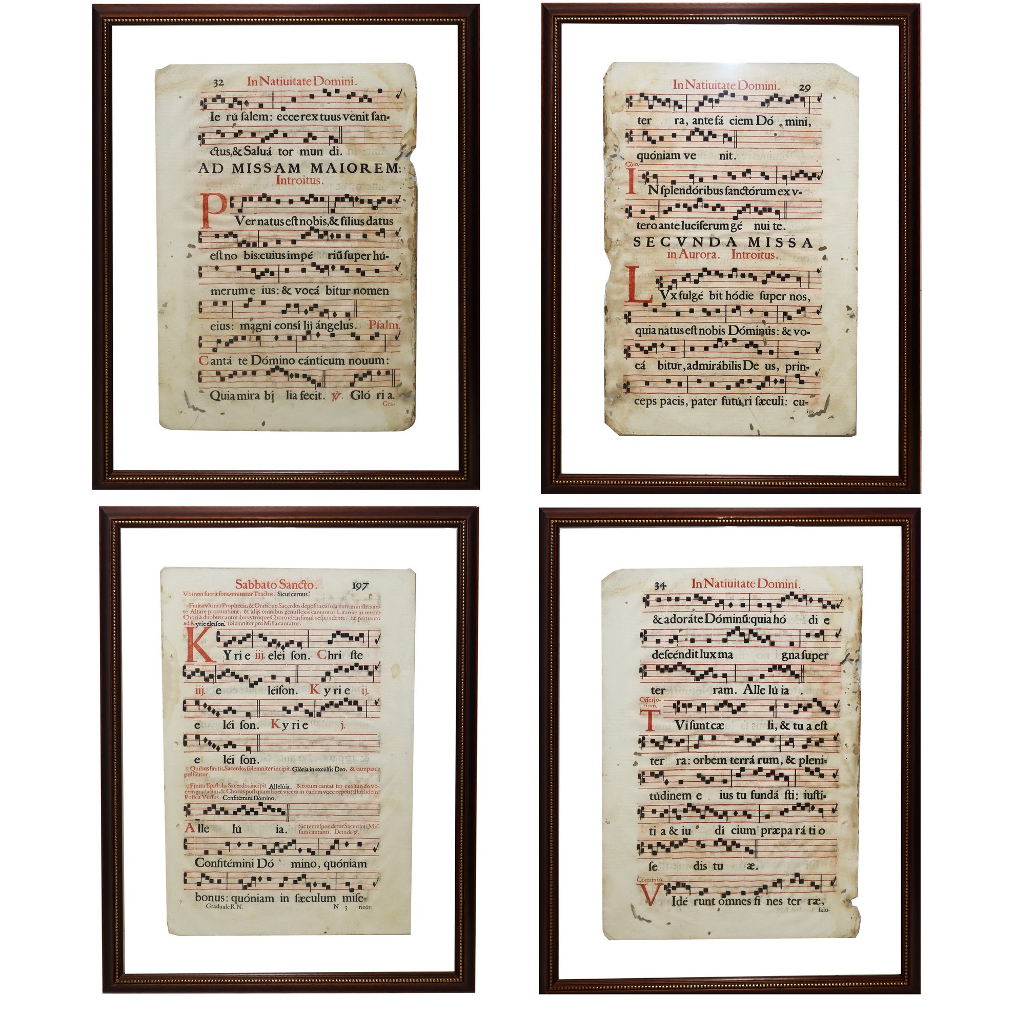 N. 4 Antifonari musica sacra "In Nativitate Domini", XVI Secolo in folio mm 420 x 280, in cornice cm 56 x 43 Tetragramma in inchiostro rubinio, rubricatura e capilettera in rosso. Notazione quadrata. EsemplatTetragramma in inchiostro rubinio, rubricatura e capilettera in rosso. Notazione quadrata. Esemplat
