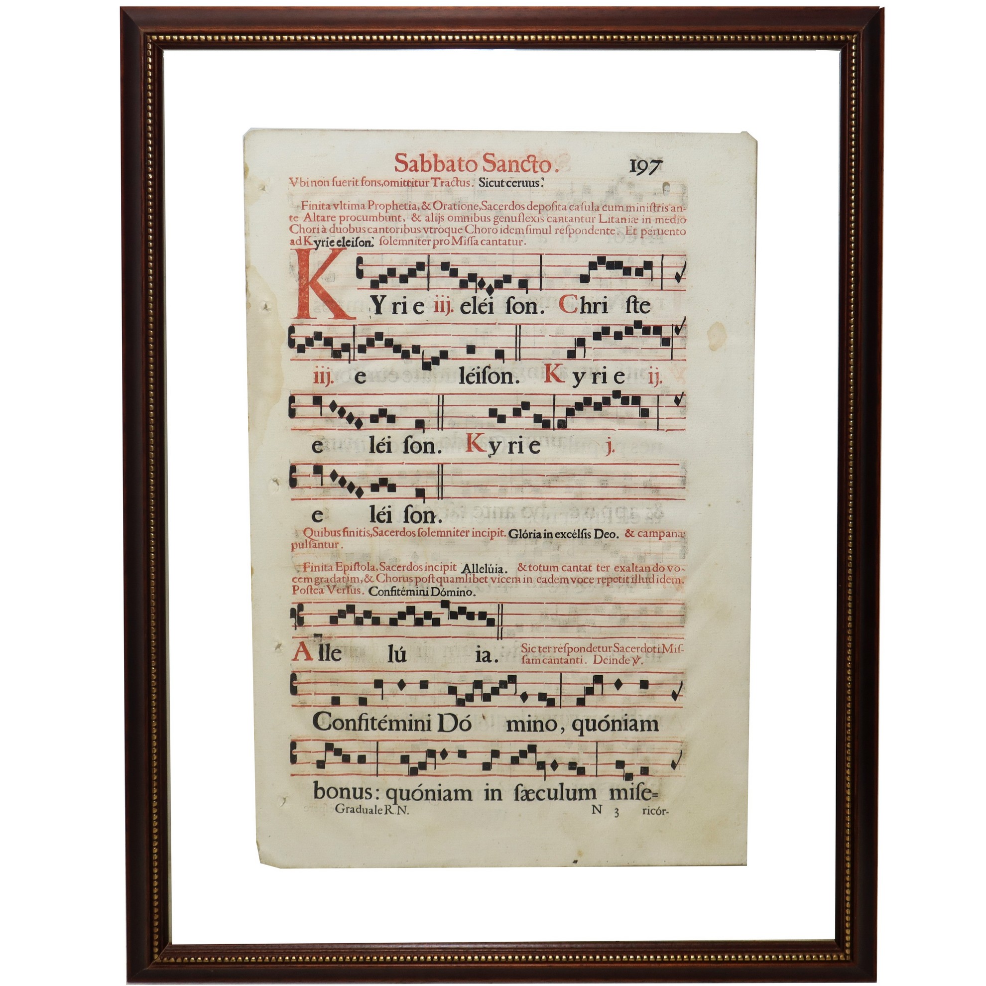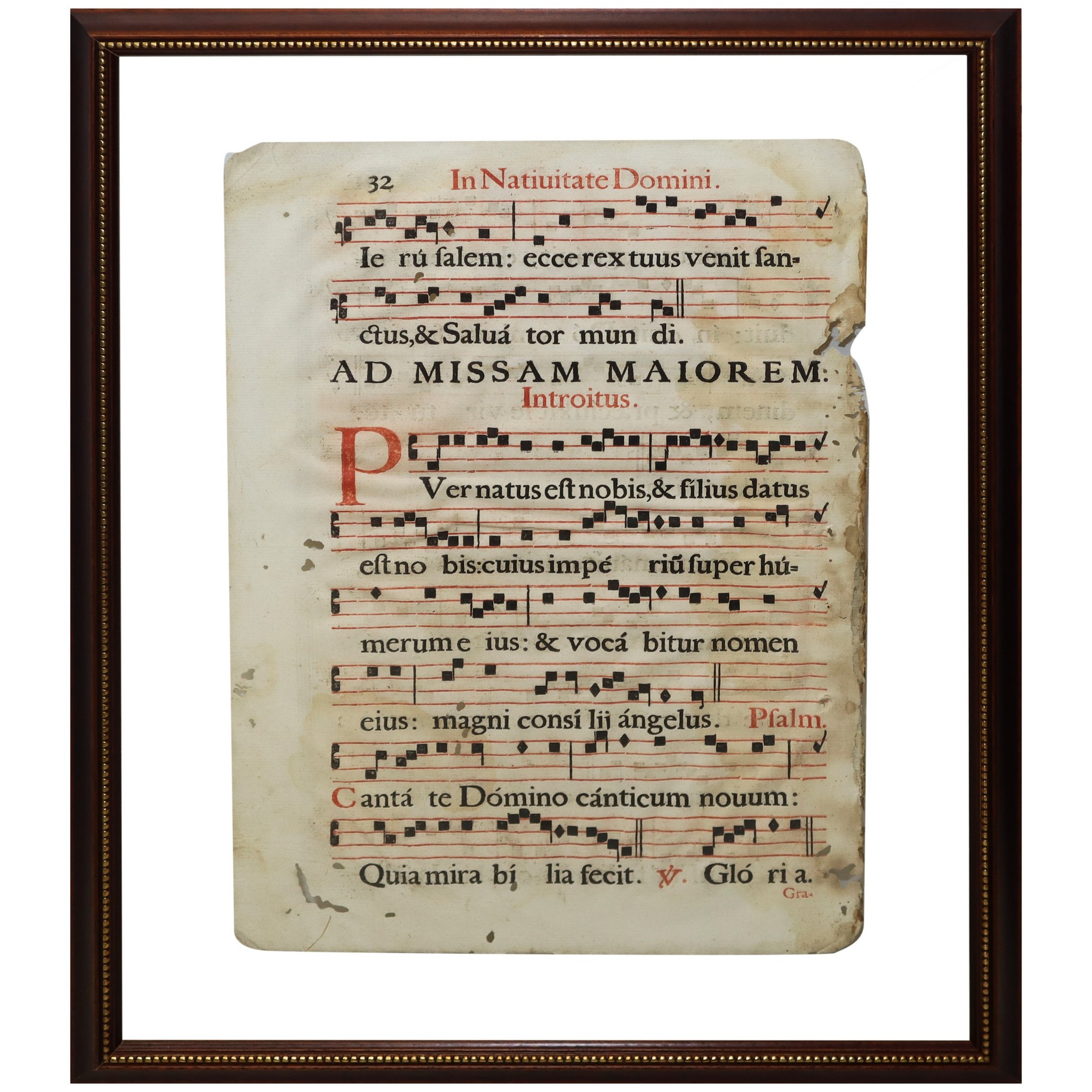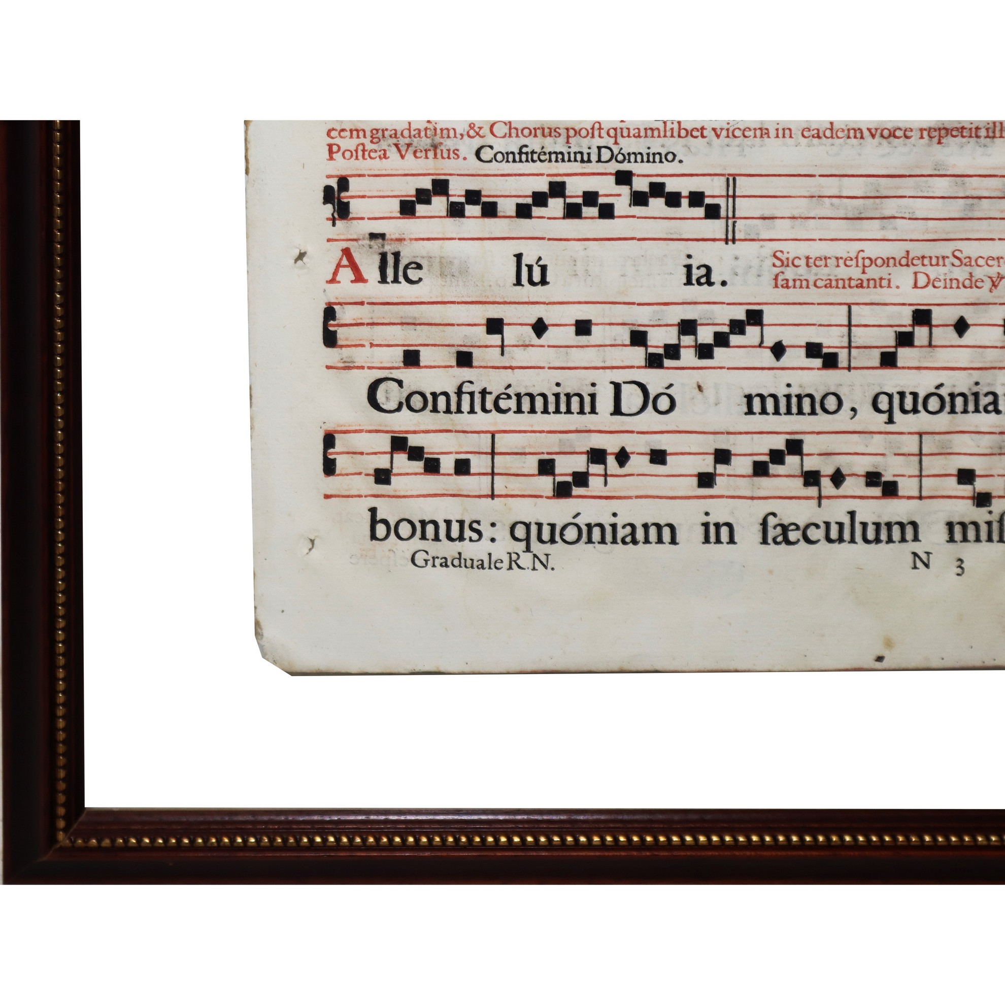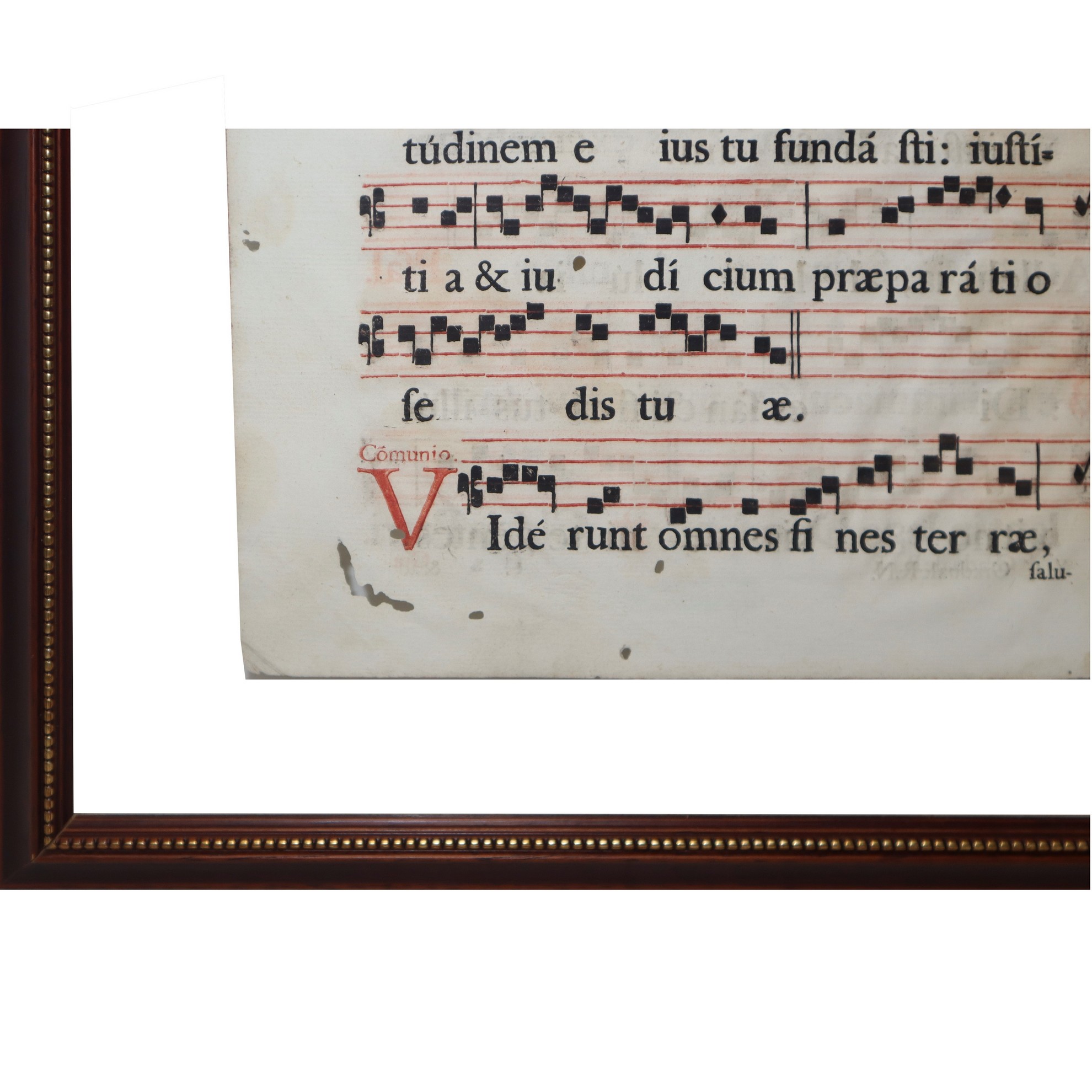 N. 4 Antifonari musica sacra "In Nativitate Domini", XVI Secolo in folio mm 420 x 280, in cornice cm 56 x 43 Tetragramma in inchiostro rubinio, rubricatura e capilettera in rosso. Notazione quadrata. EsemplatTetragramma in inchiostro rubinio, rubricatura e capilettera in rosso. Notazione quadrata. Esemplat