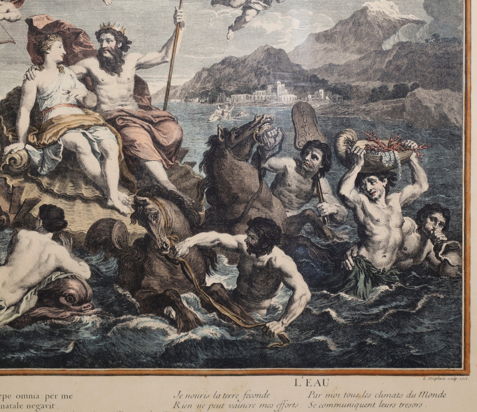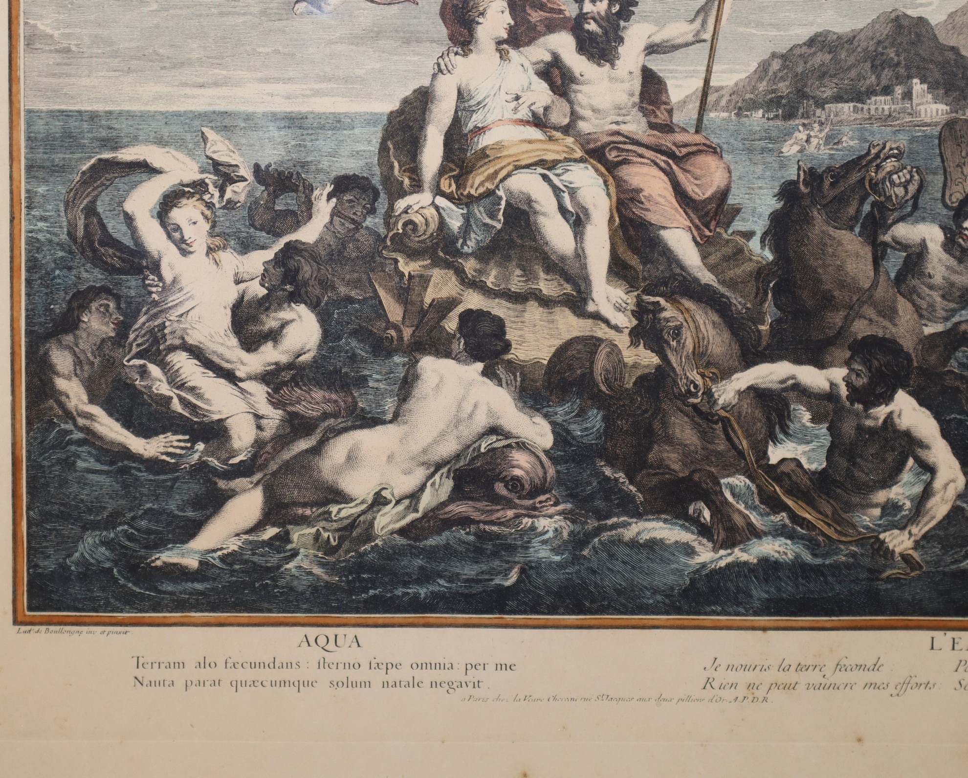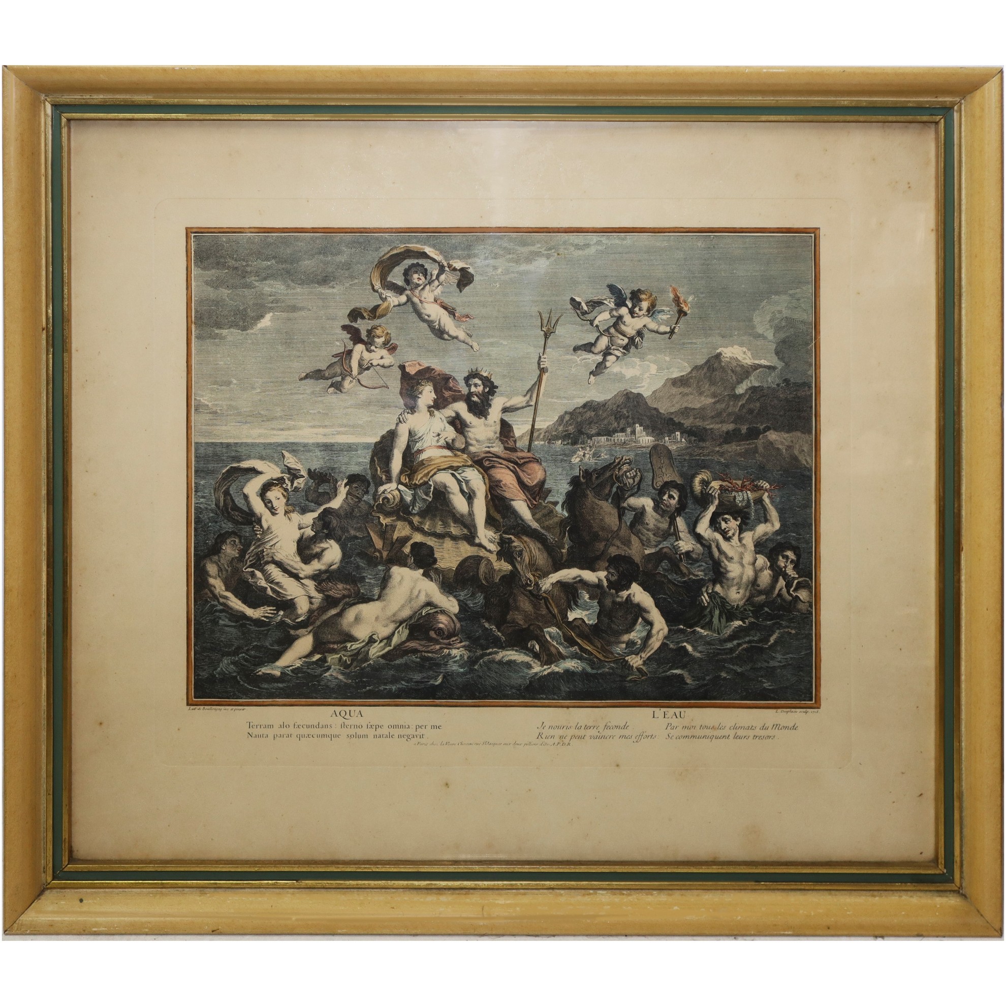 Coppia di stampe in cornice con soggetto mitologico, Primi 20° Secolo 490 mm x 570, in cornice cm 53 x 62 stampa acquarellata Carol Dupuis, 1721 "Terra" L. Despaces 1718, "Acqua"