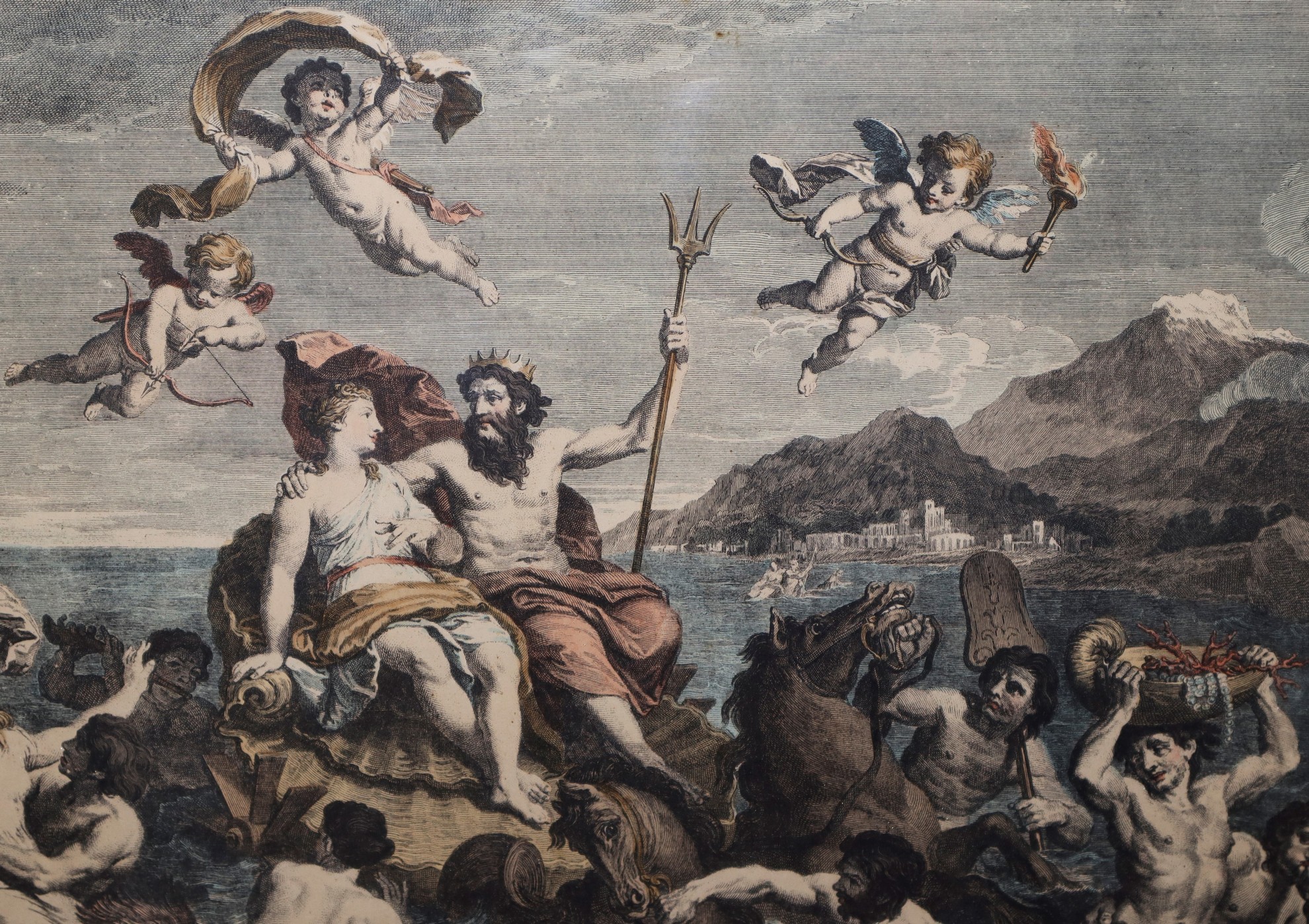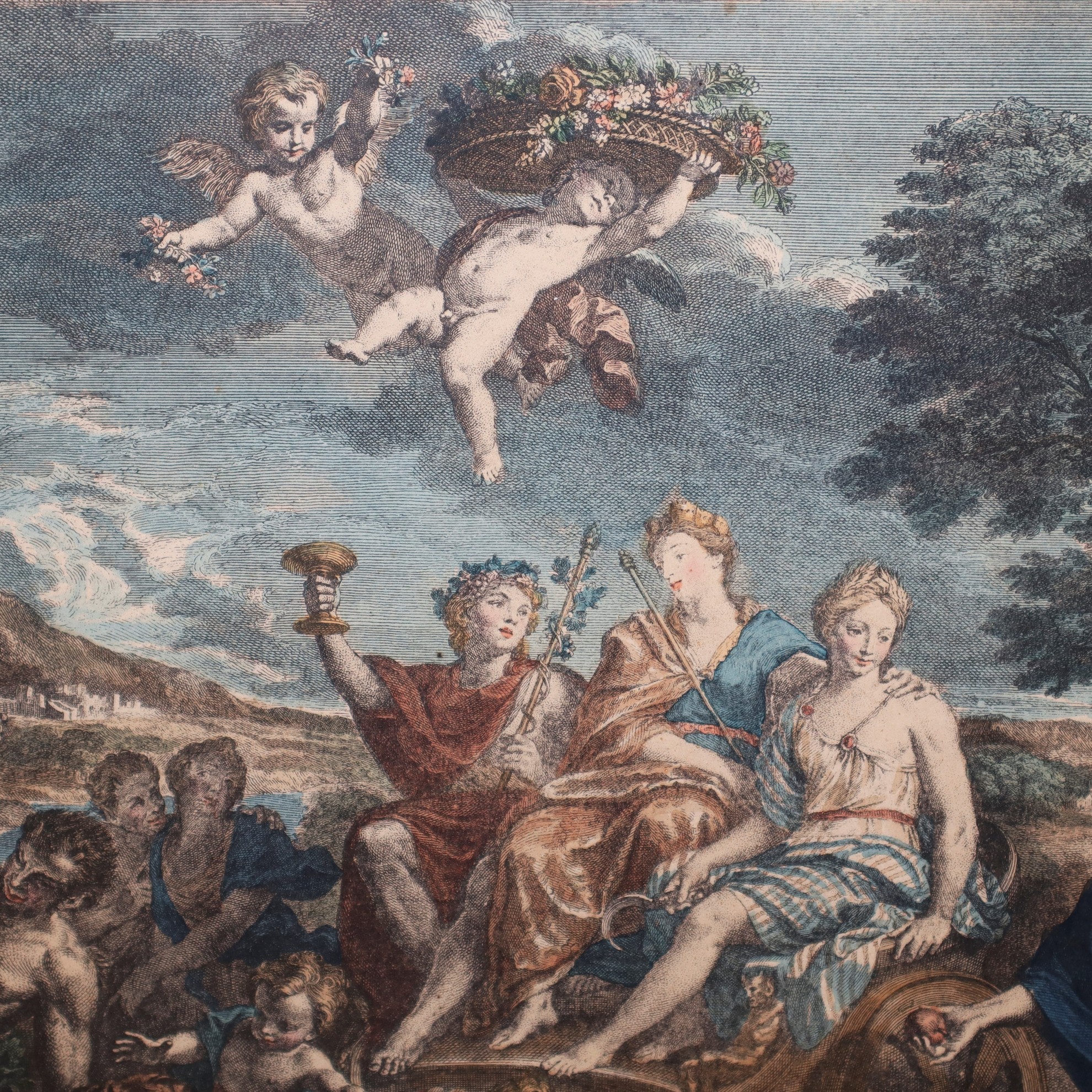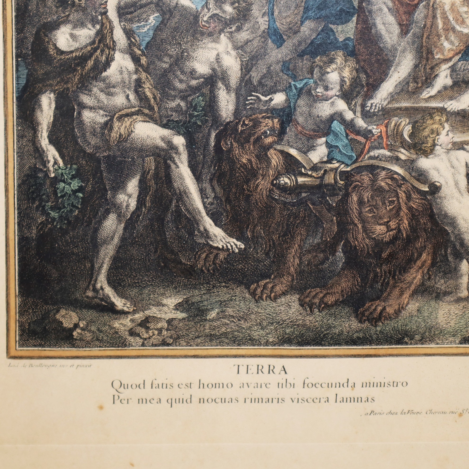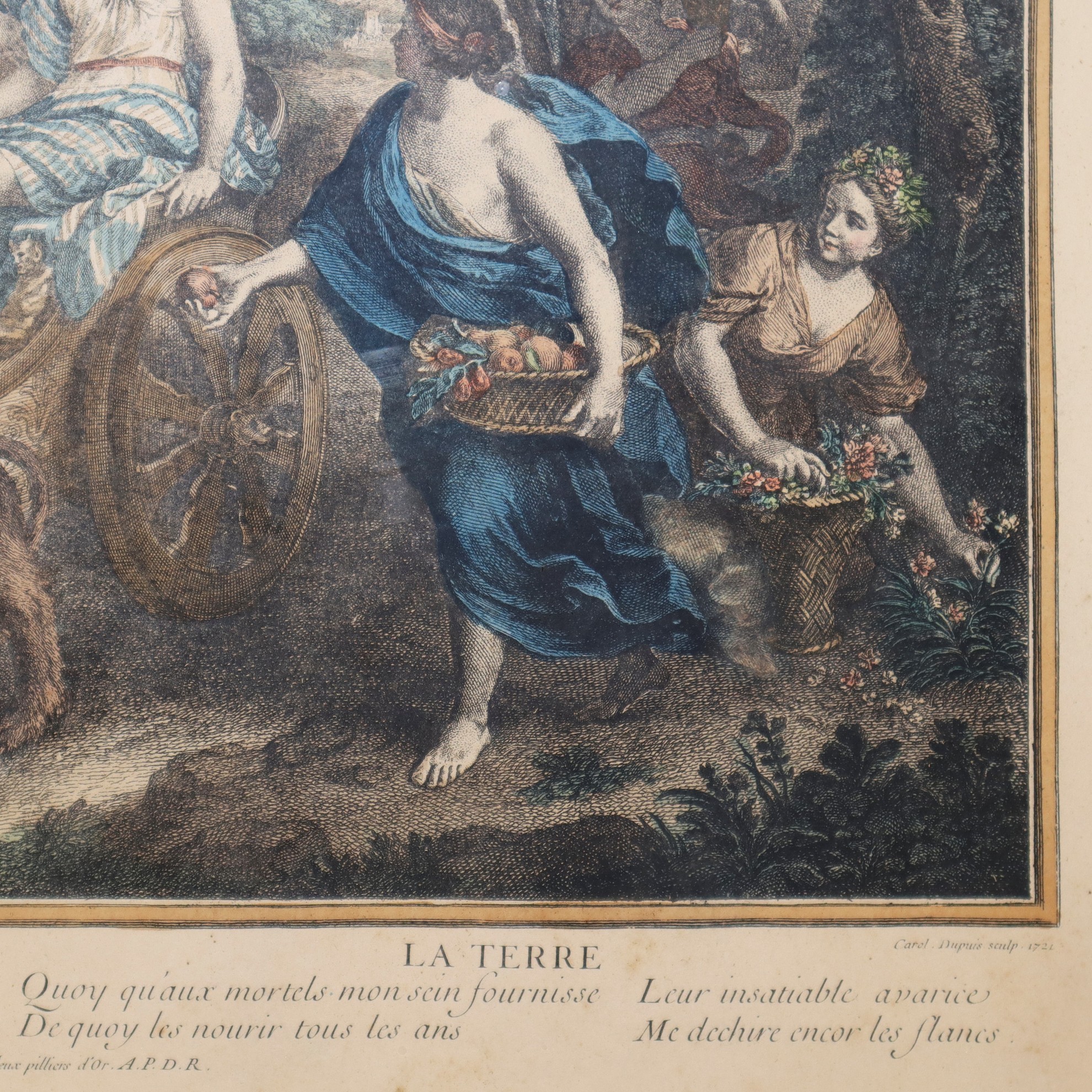 Coppia di stampe in cornice con soggetto mitologico, Primi 20° Secolo 490 mm x 570, in cornice cm 53 x 62 stampa acquarellata Carol Dupuis, 1721 "Terra" L. Despaces 1718, "Acqua"