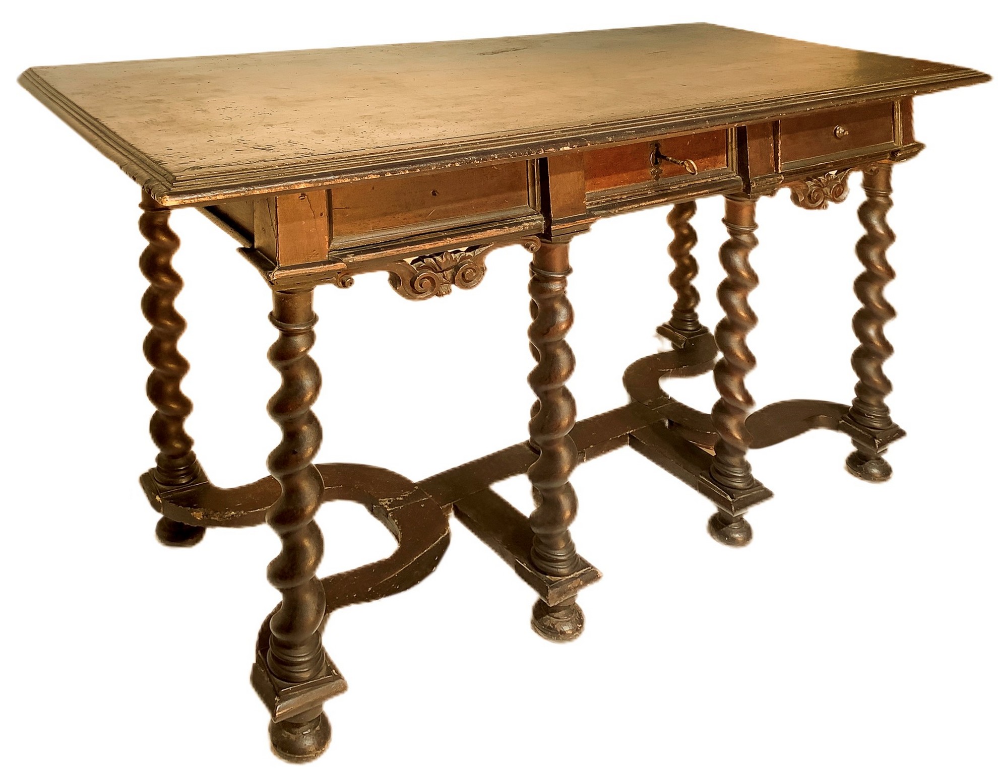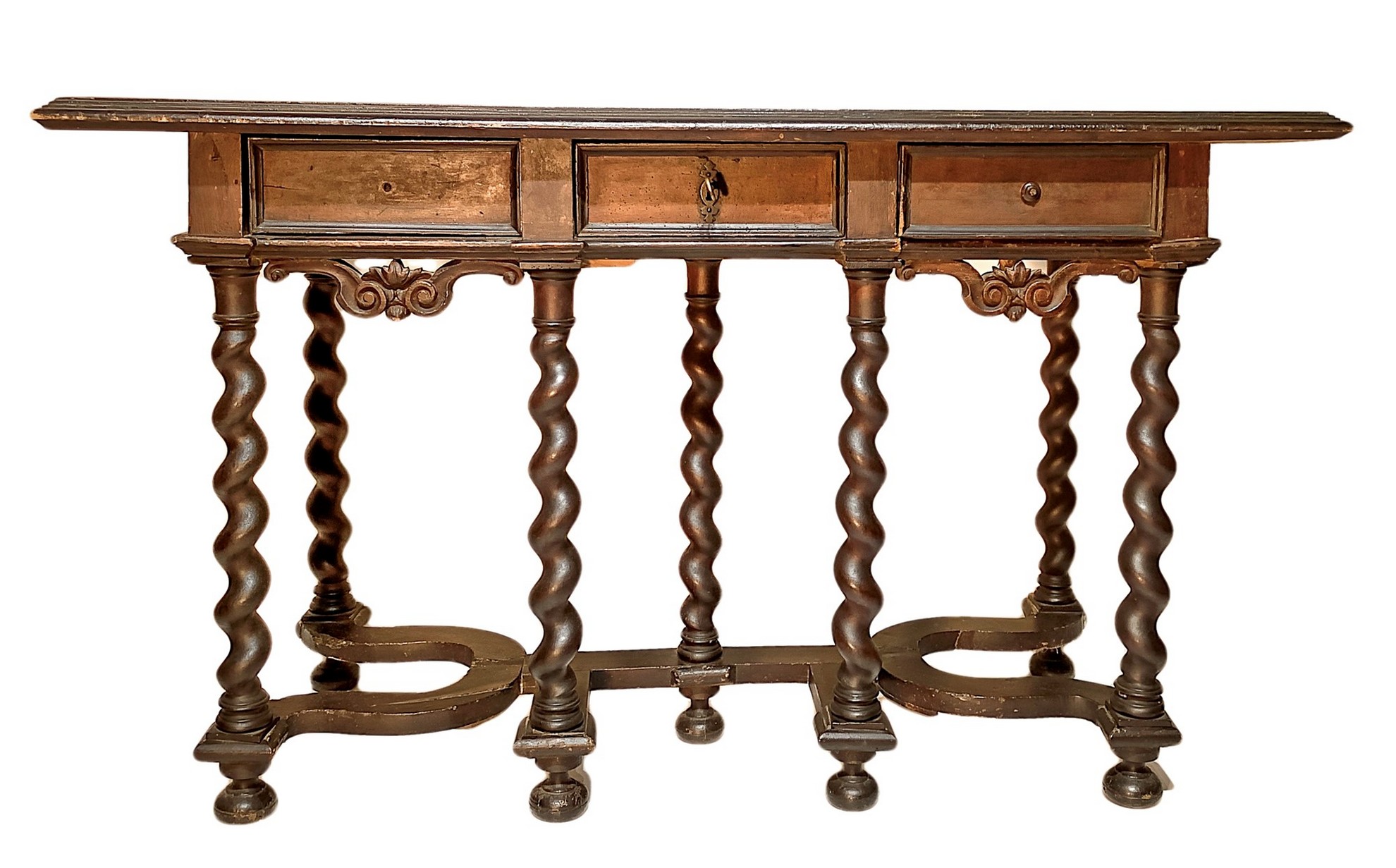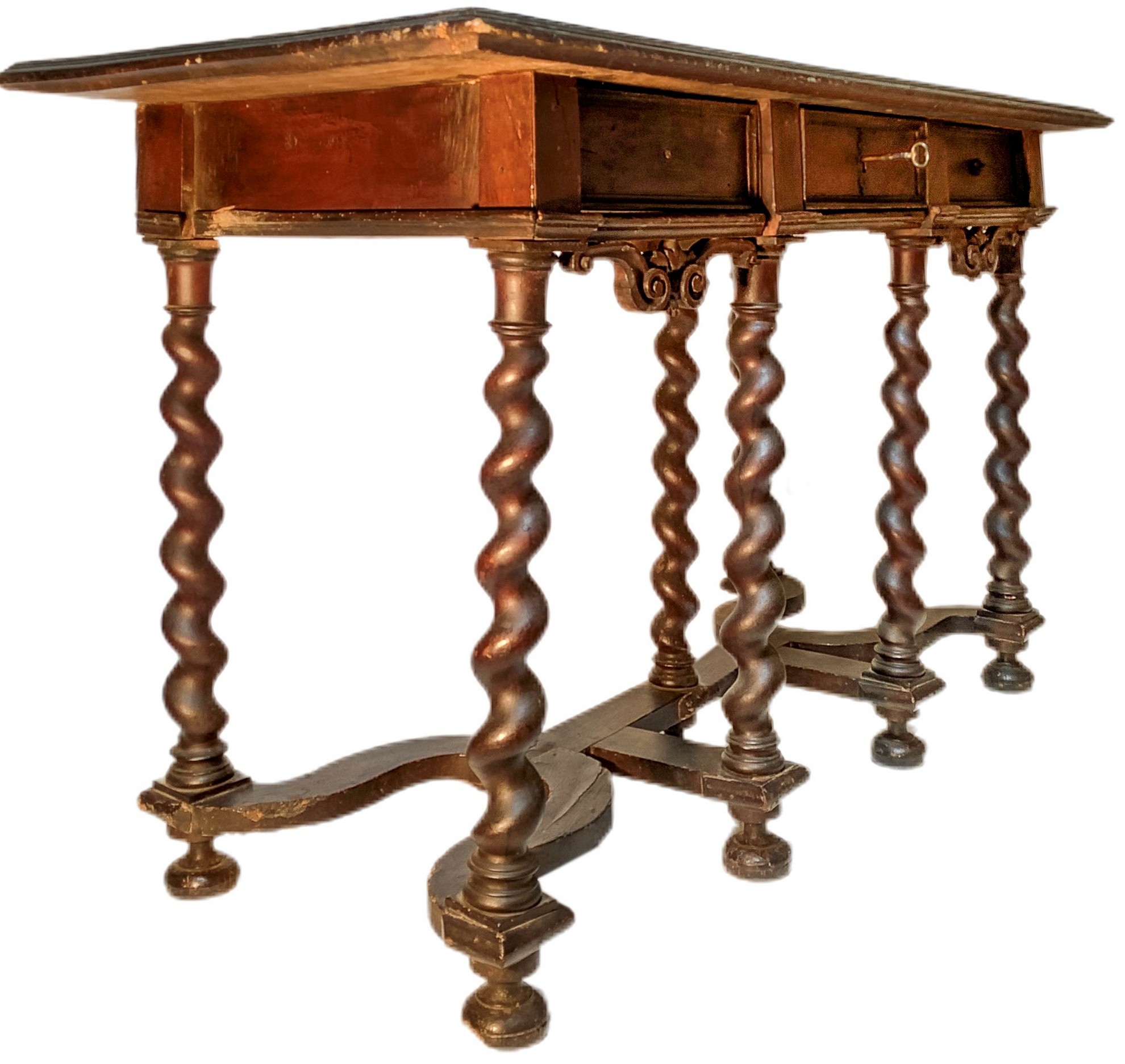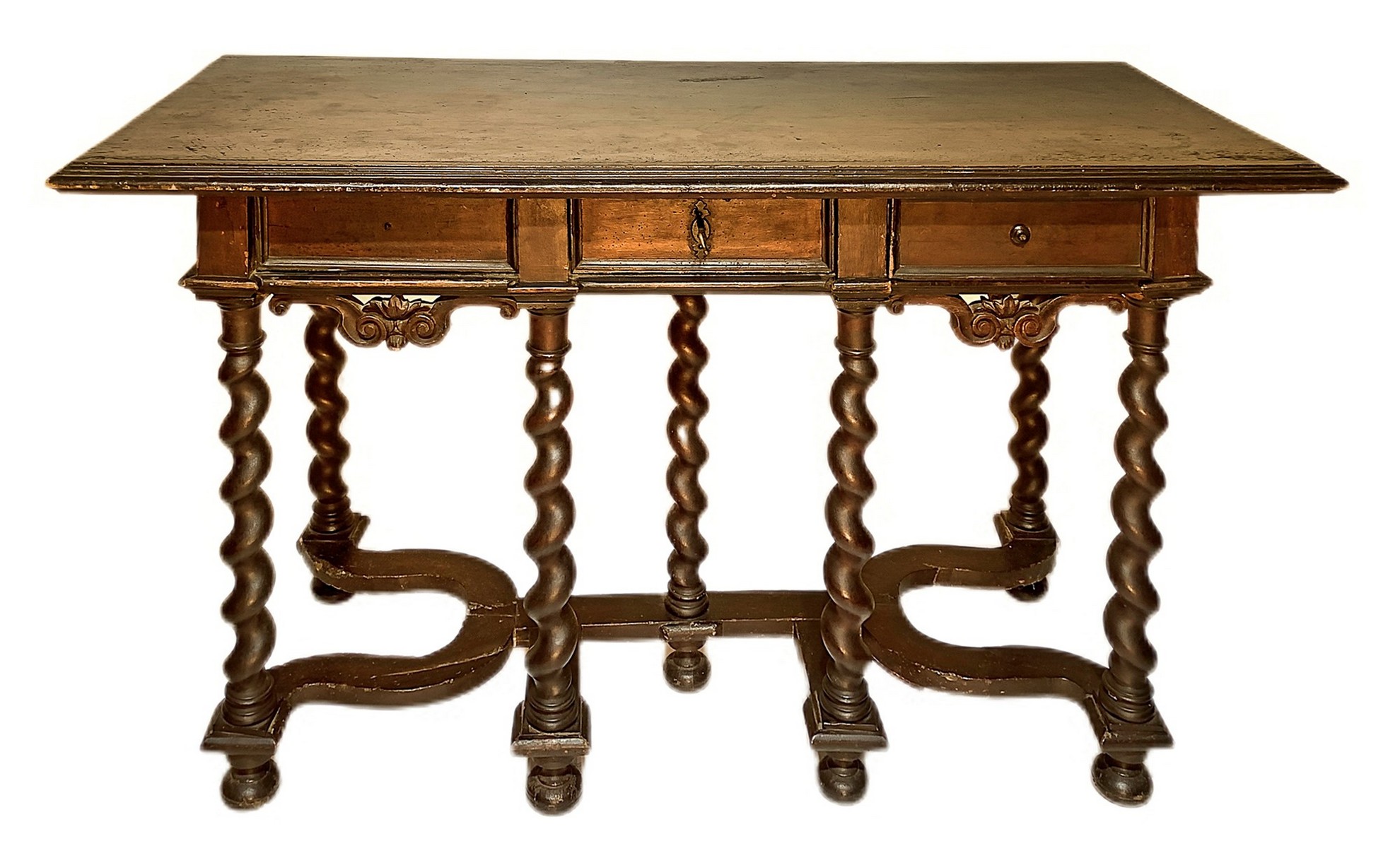 Tavolo scrittoio in legno massello di noce da muro, , Louis XIII, 17° Secolo. H cm 78x142x73 Piano bordato a becco di civetta, tre cassetti al sottopianoe n. 7 strutture a torciglione terminanti con basi a cipolla schiacciata.Piano bordato a becco di civetta, tre cassetti al sottopianoe n. 7 strutture a torciglione terminanti con basi a cipolla schiacciata.
