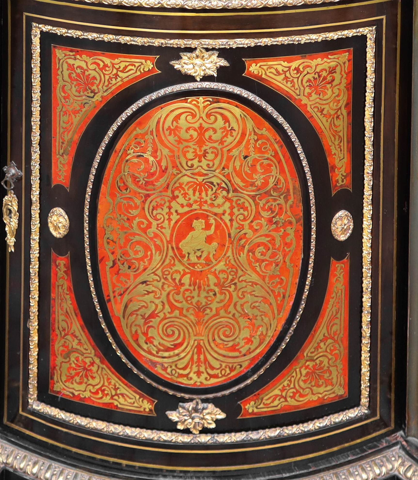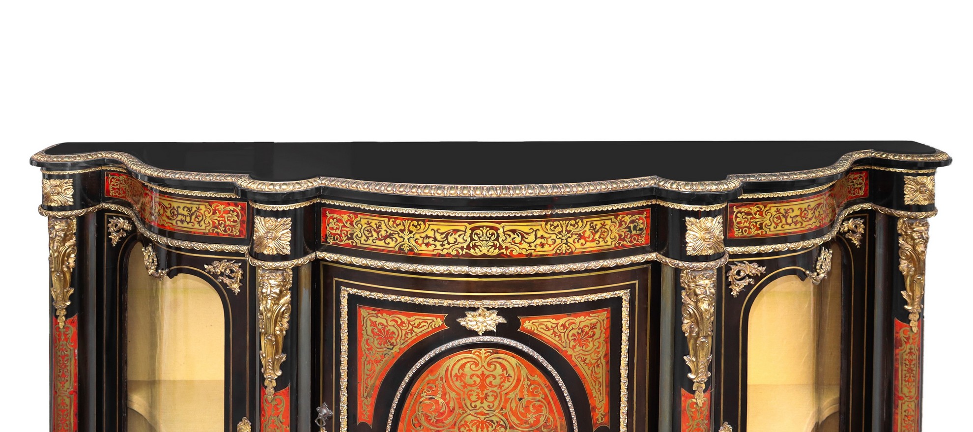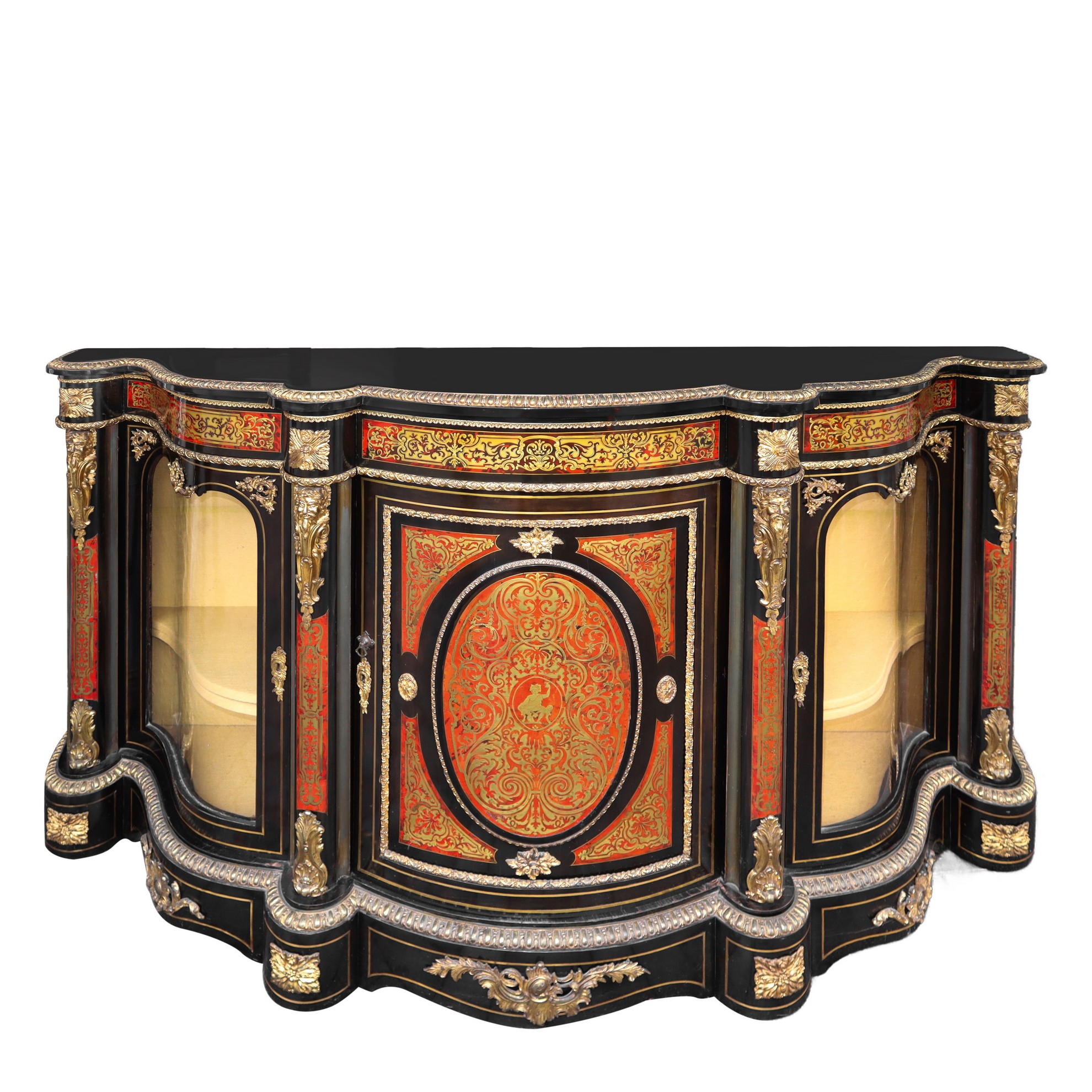 Etagère nello stile boulle con bronzi su marquetterie di tartaruga e rame, Napoleon III, France Fine 19° Secolo H cm 116 x L cm 208 x P cm 52 Con sportelli laterali in vetro bombatoCon sportelli laterali in vetro bombato