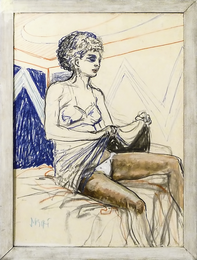 ALBERTO SUGHI (1928-2012) Interno con ragazza - Interior with Girl tecnica mista su carta applicata a tela - mixed media on paper laid on canvas, firmato, in cornice, alcuni difetti ai margini - few defects on margins cm 100x70