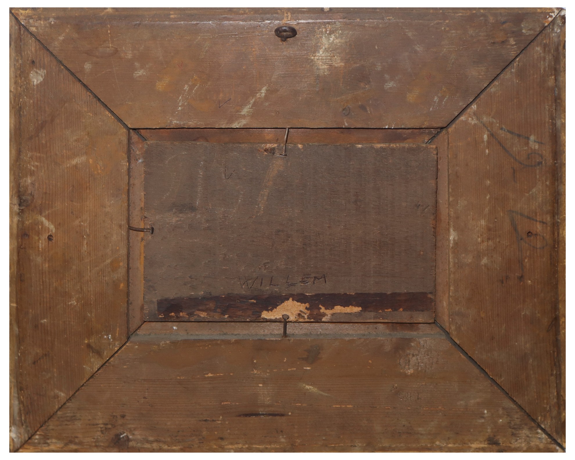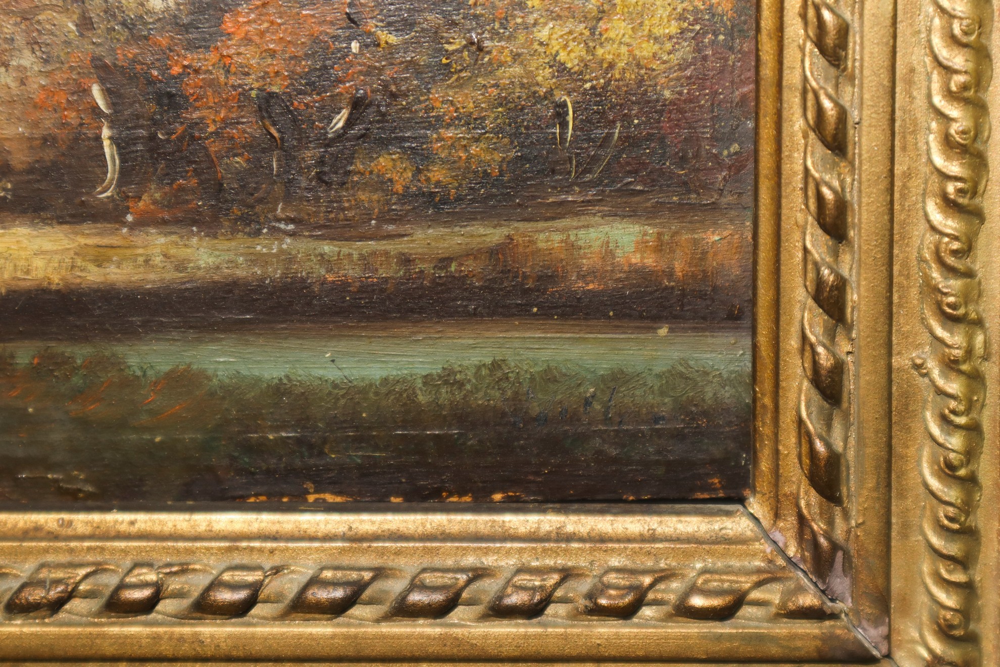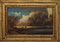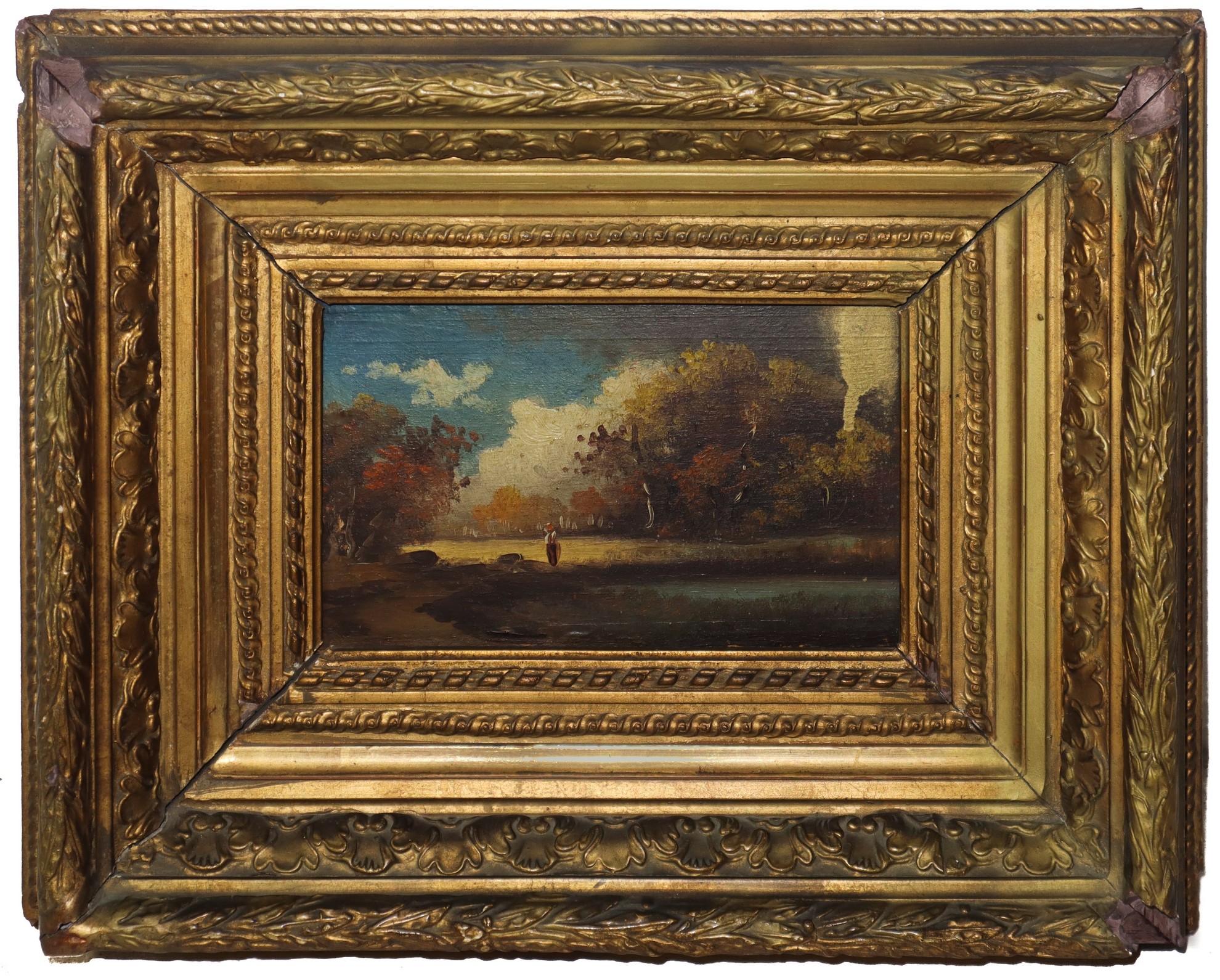 Paesaggio con personaggio, Fine 19° Secolo cm 11,5 x cm 19, in cornice cm 30 x cm 37 dipinto su tavoletta Firmato sul lato in basso a destra. Cornice da restaurare