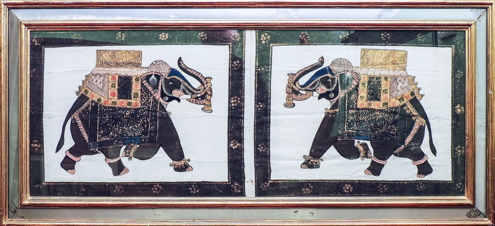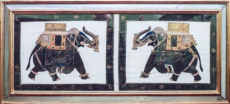 COPPIA DI PANNELLI DECORATIVI - A PAIR OF DECORATIVE PANELS India, inizio XX secolo - beginning of 20th century raffiguranti elefanti, in un'unica cornice cm 40x110