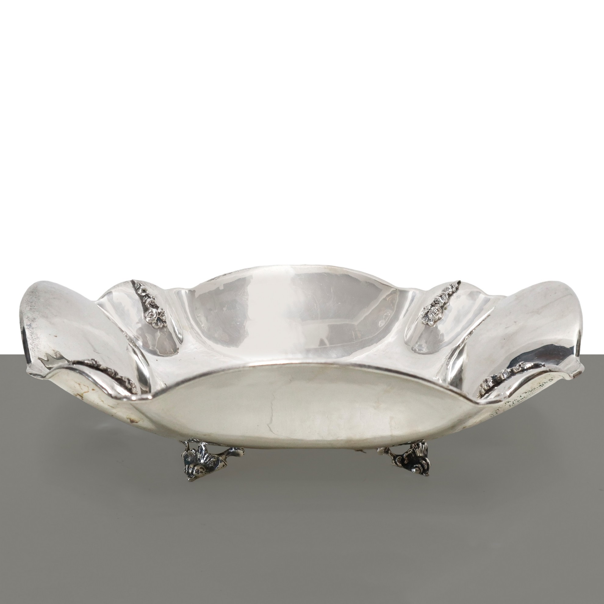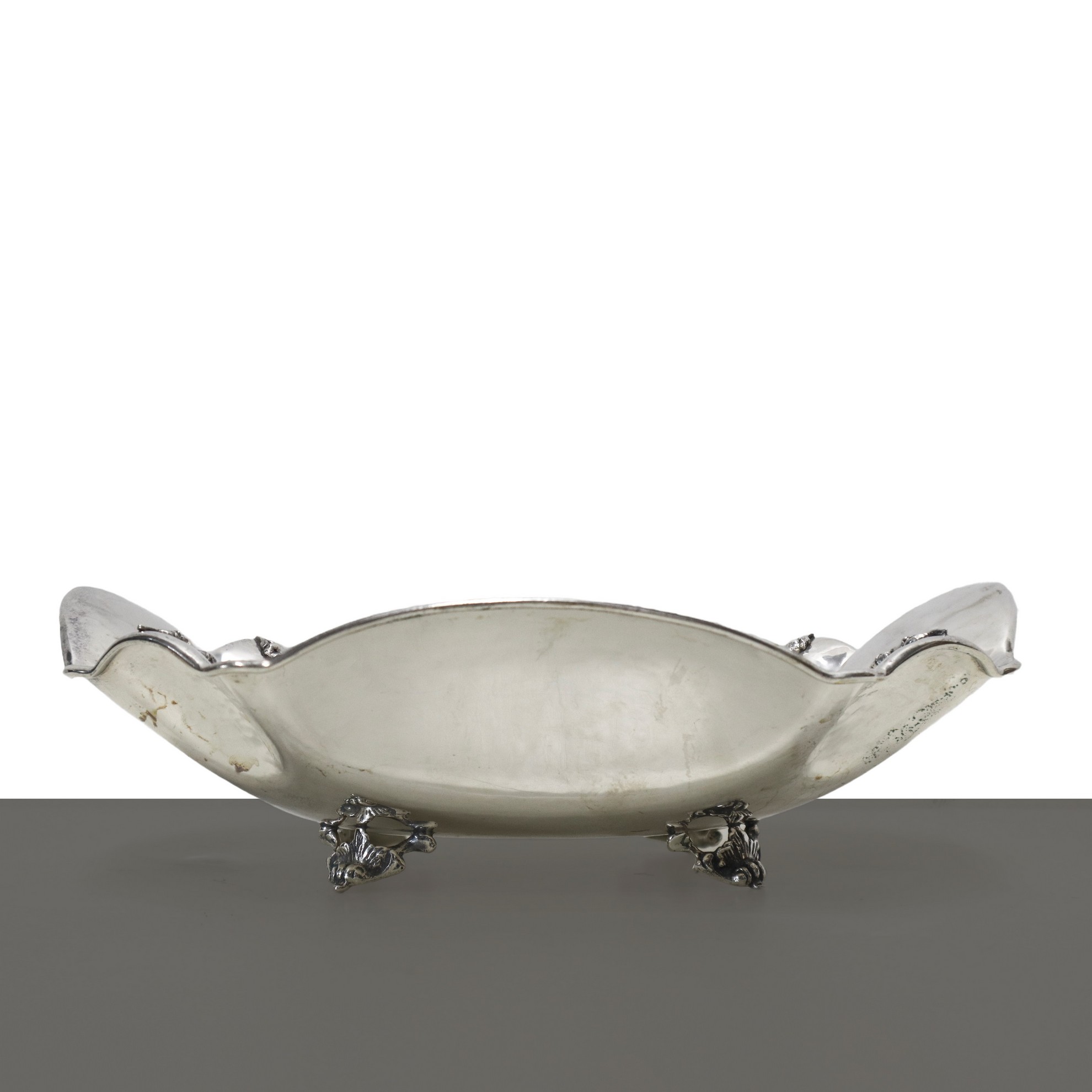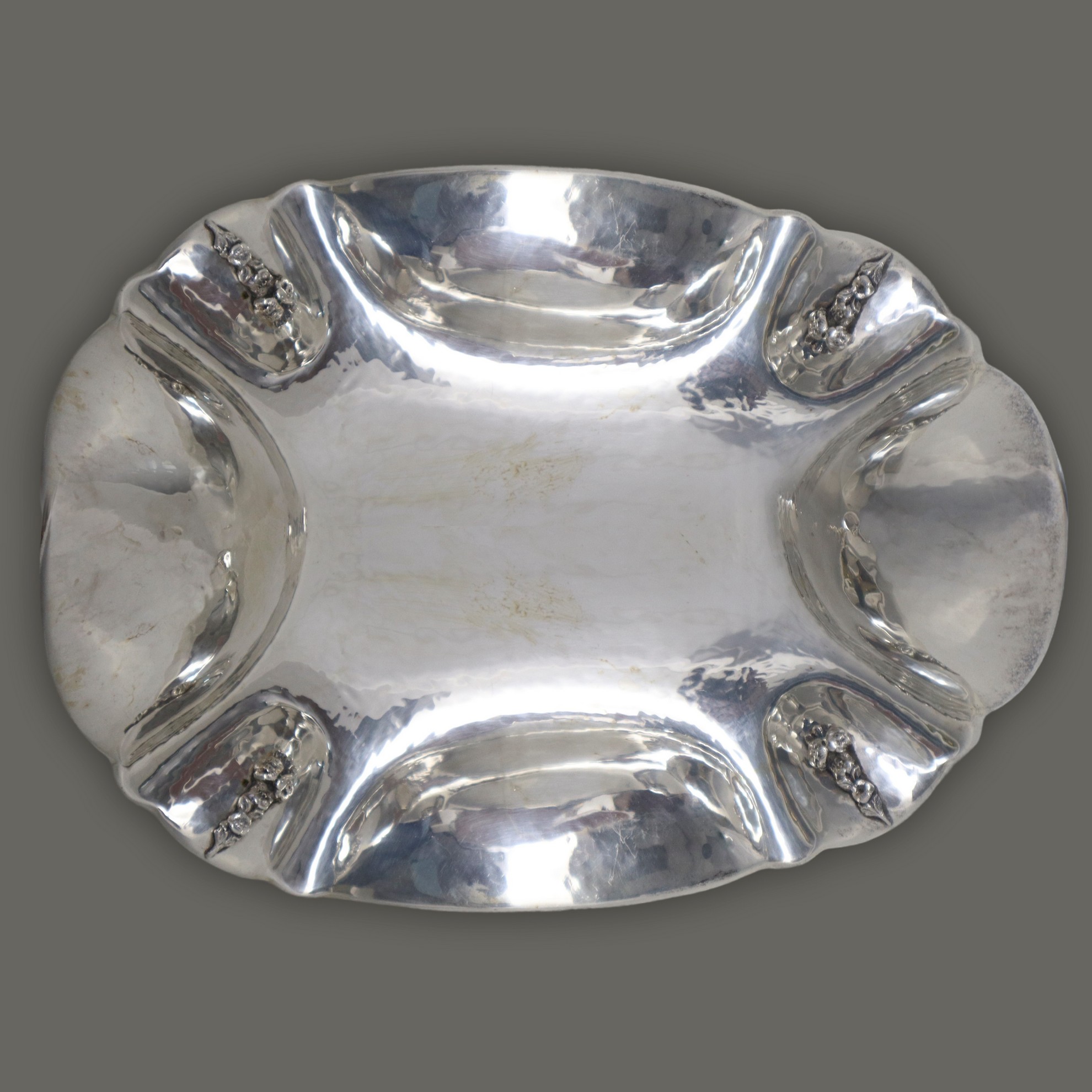 Vassoio svuota tasche, 20° Secolo g 334 / h cm 6 / d 22 x 17 Lavorato a lobi con applicazione agli angoli di ghirlande di fiorateLavorato a lobi con applicazione agli angoli di ghirlande di fiorate