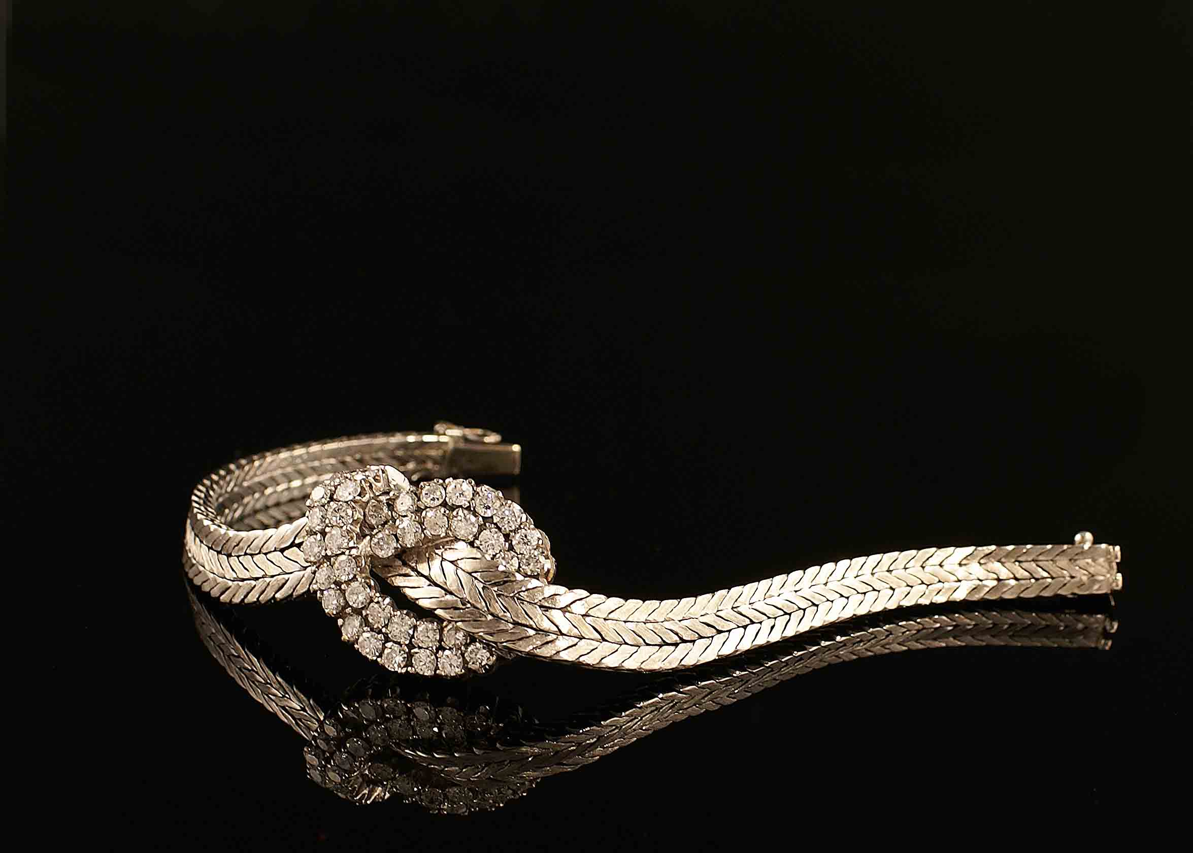 Bracciale in oro bianco satinato 18kt maglia a spina di pesce con al centro incastonati diamanti taglio brillante per carati 2 circa, gr. 28,9 (2 maglie in più).
