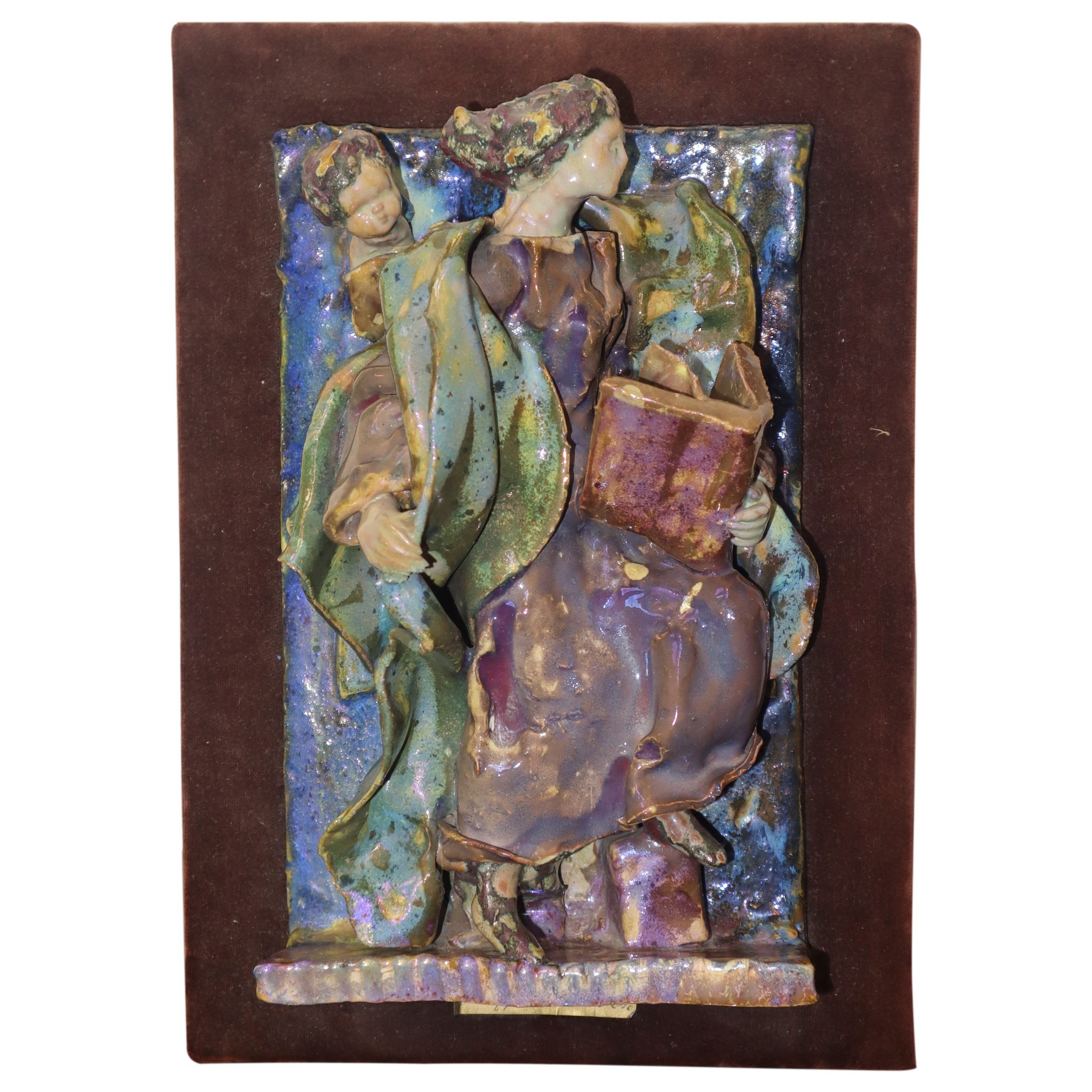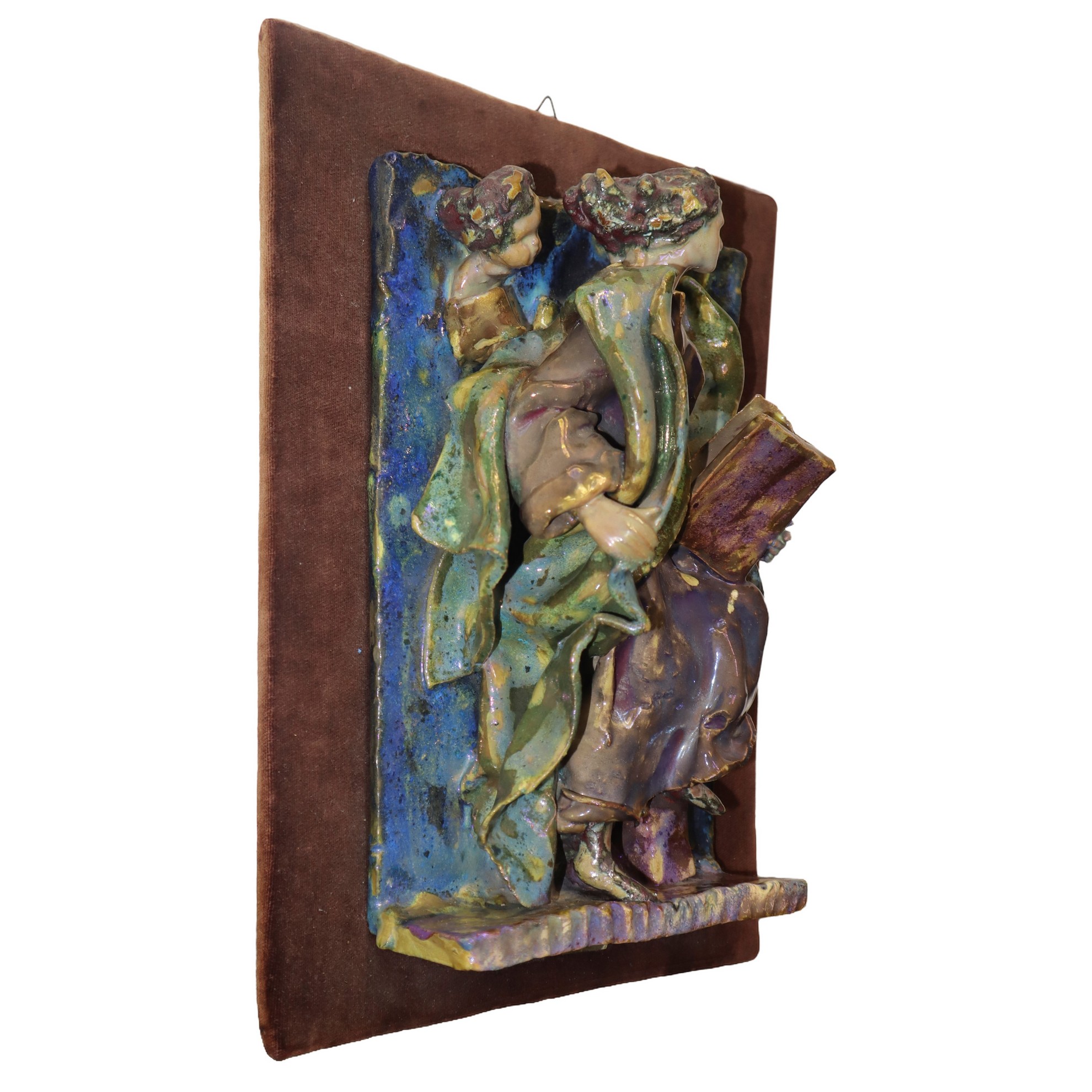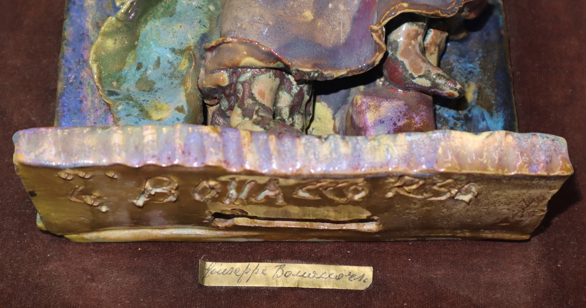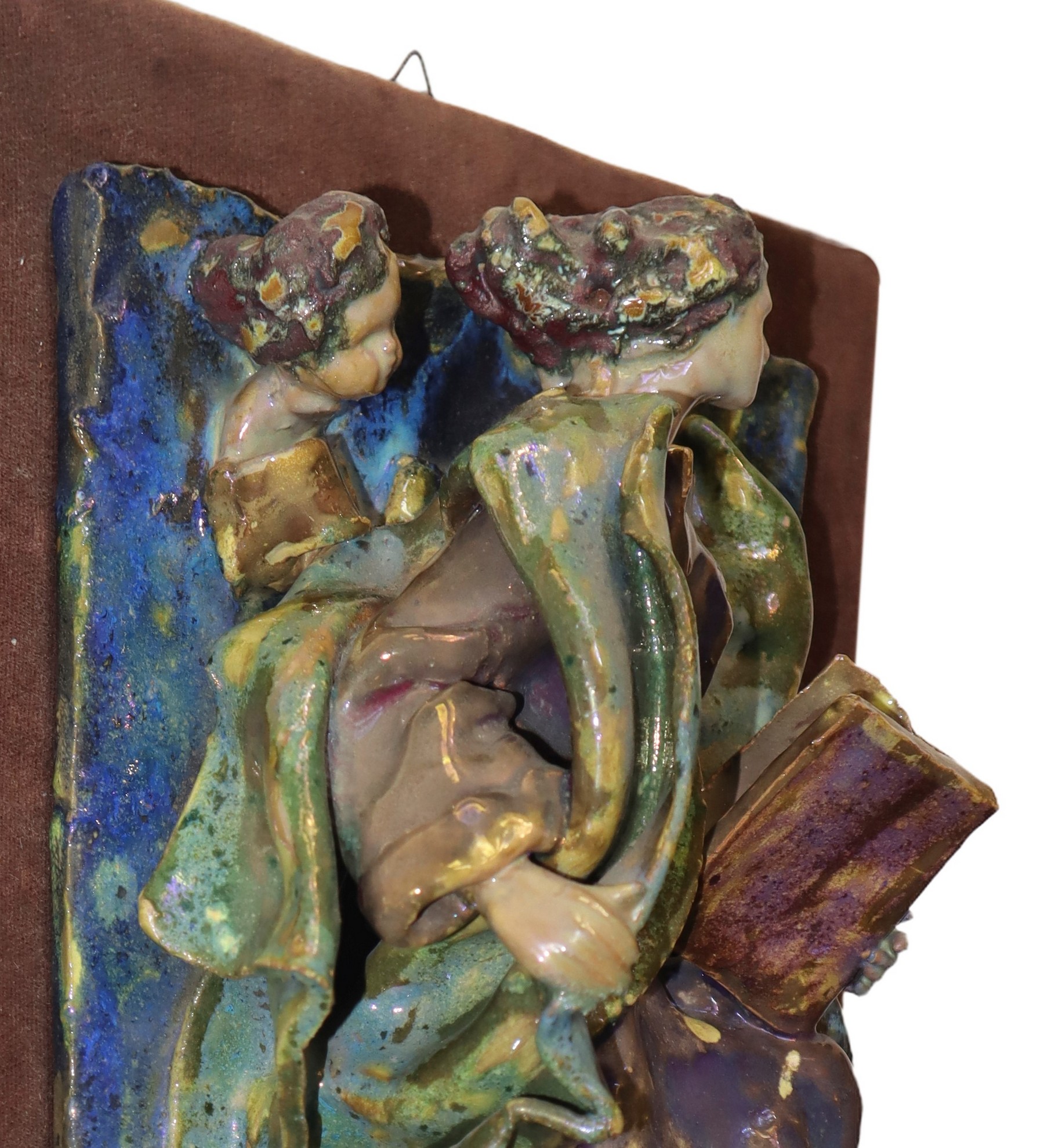 Caltagirone Giuseppe Bonaccorso - Statua di donna con libro e angioletto in maiolica policroma di Caltagirone, 20° Secolo h cm 28 x 18 x 7 Lavorata a lustro, firmata alla base Giuseppe Bonaccorso, applicata a base di legno in velluto.Lavorata a lustro, firmata alla base Giuseppe Bonaccorso, applicata a base di legno in velluto.