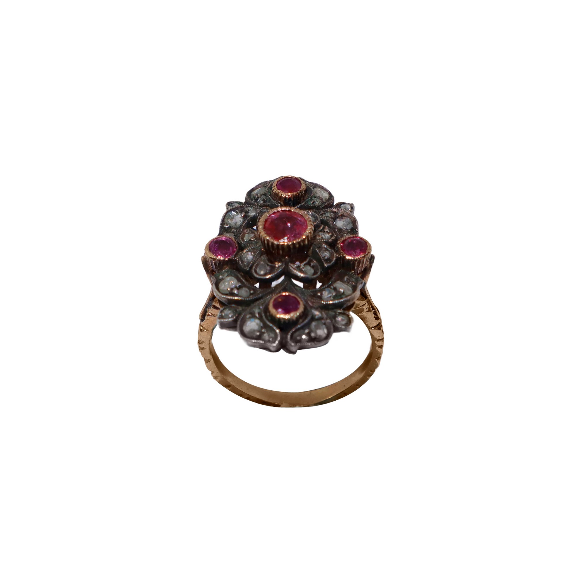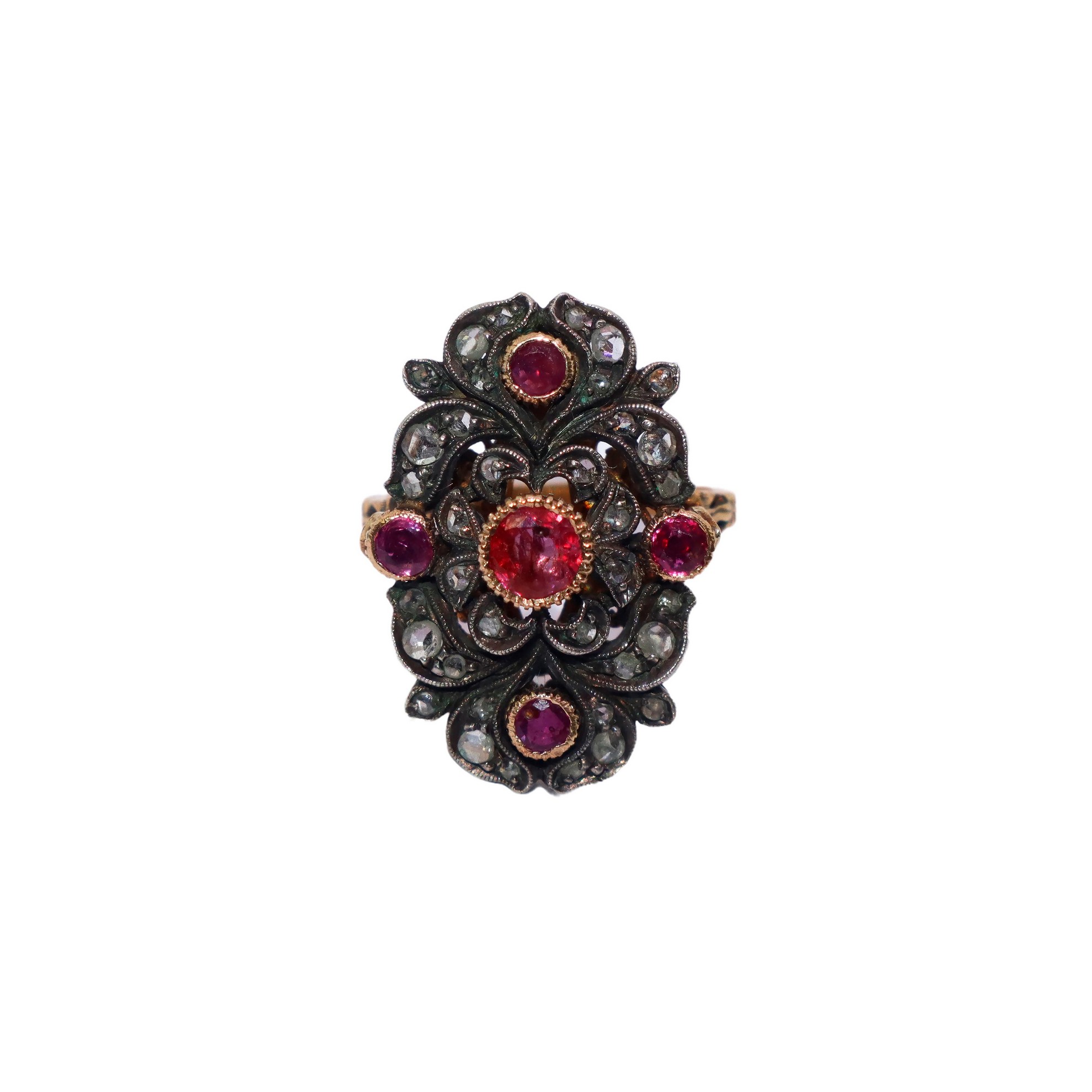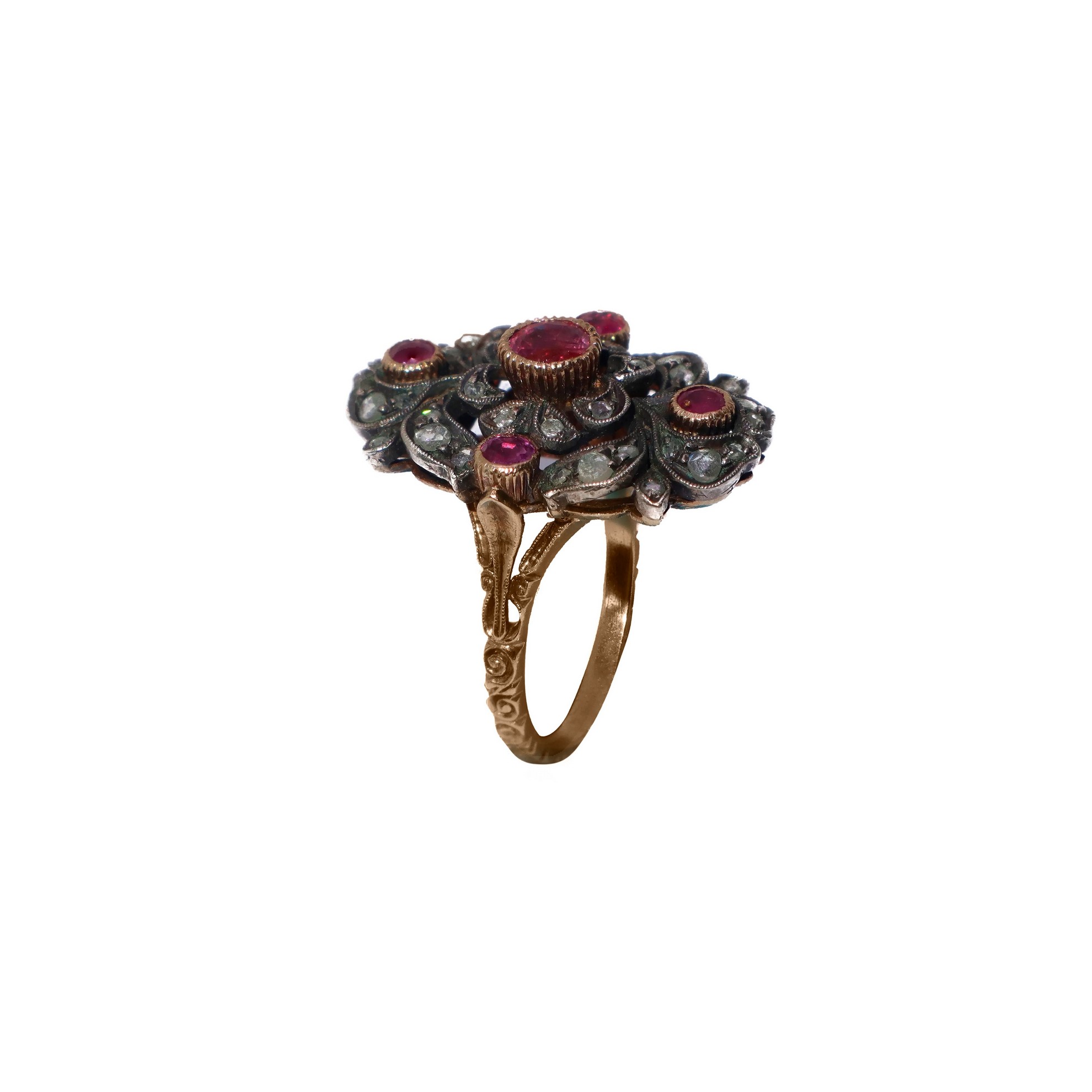 Anello in oro e argento antica lavorazione con rubini e scagliette di brillanti