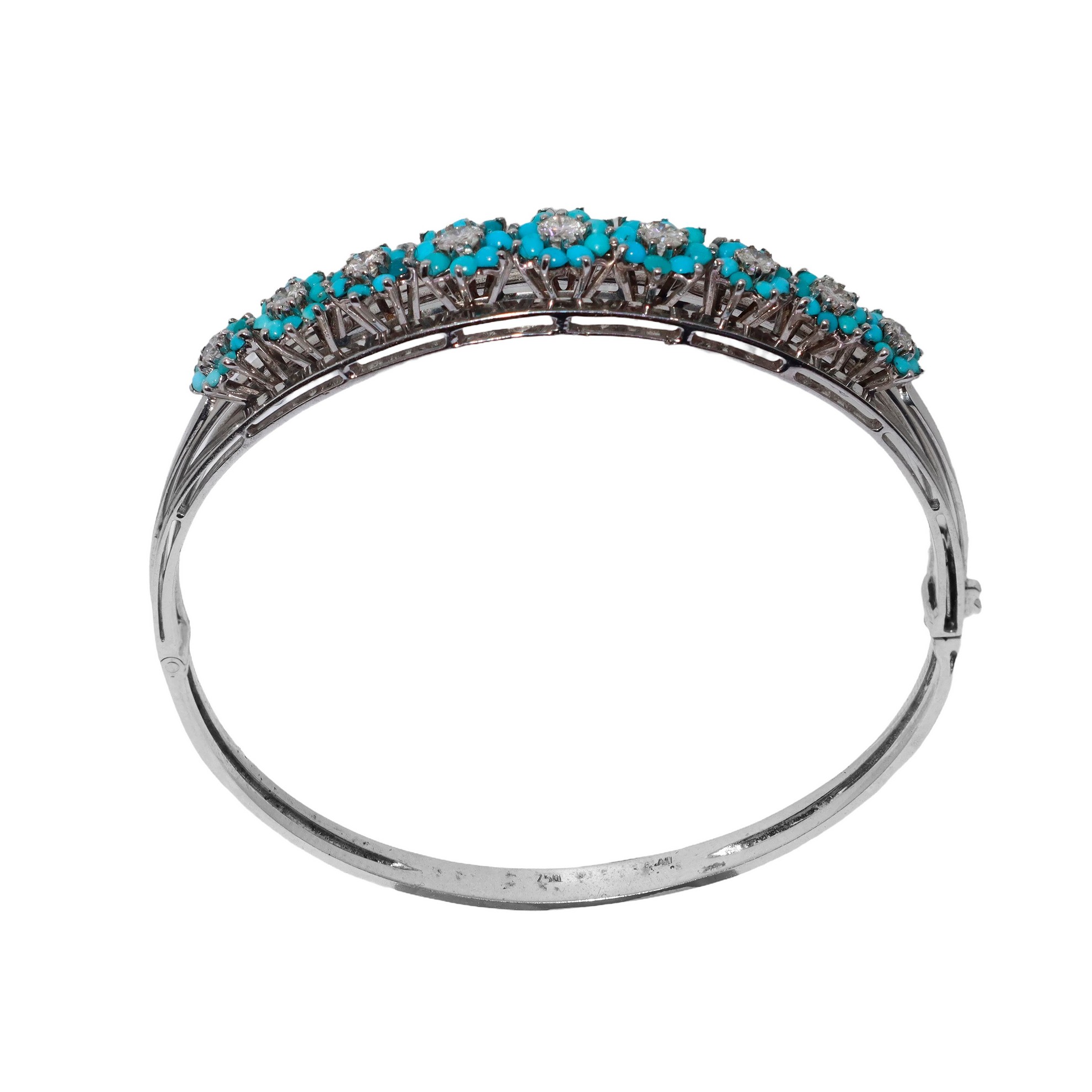 Bracciale in oro bianco con piccole roselline con al centro brillante e turchesi brillanti 0,65 ca. peso totale gr 16,8
