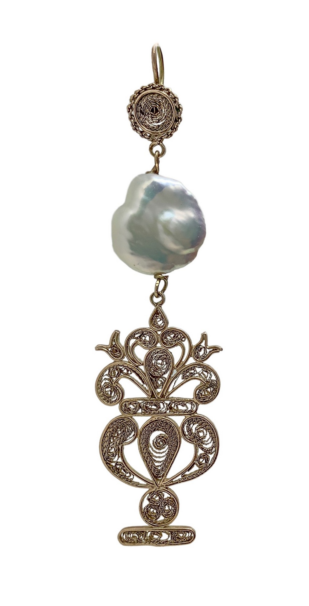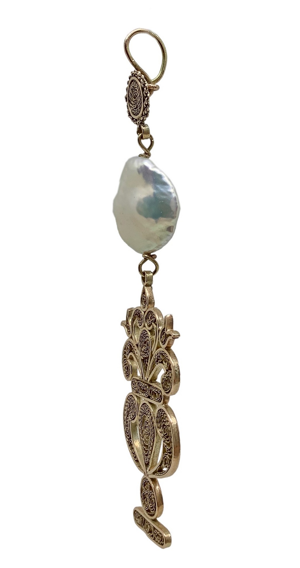 Ciondolo in oro basso titolo, filigrana a forma di vaso con perla di acqua dolce, Fine 19° Secolo