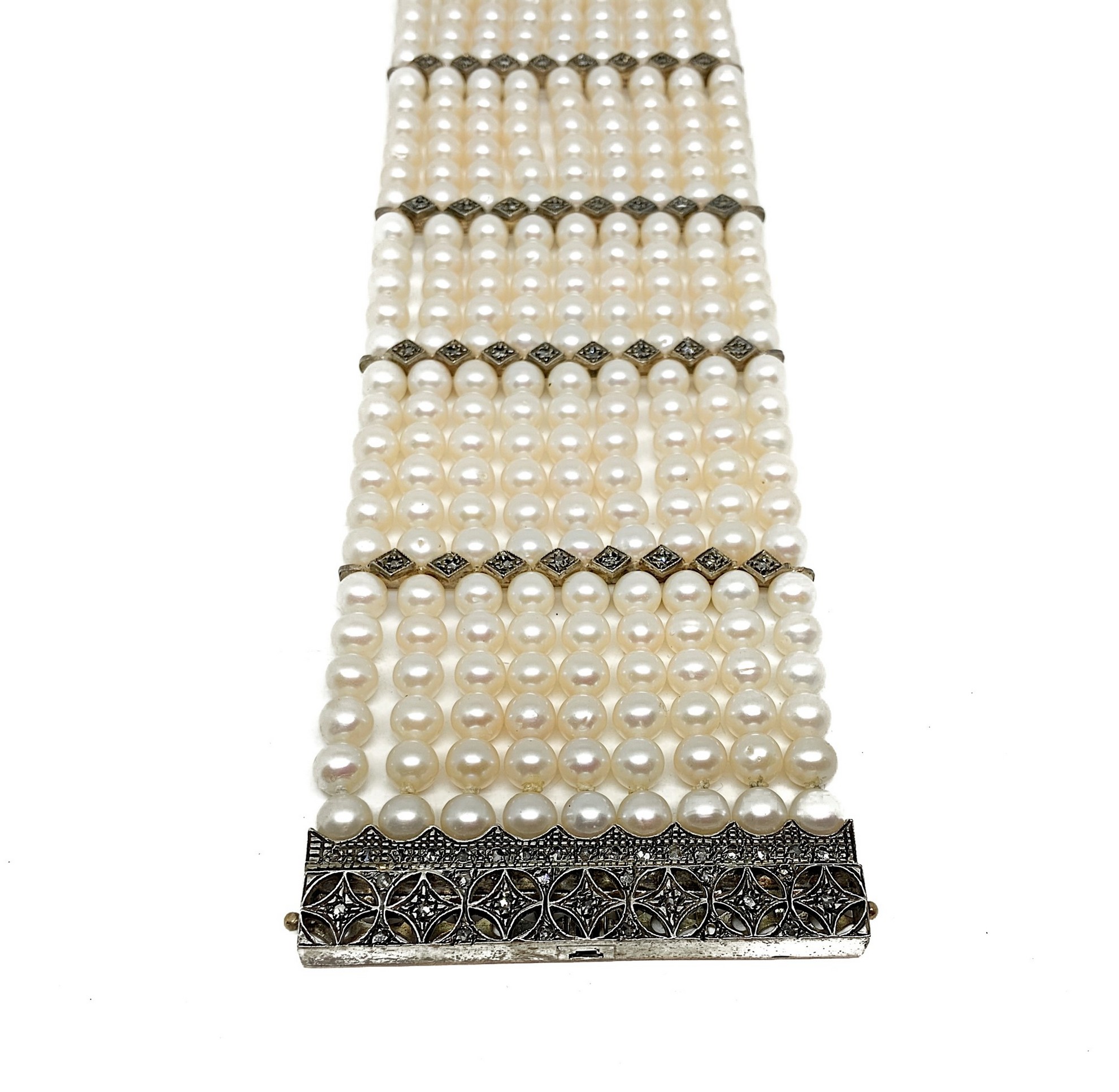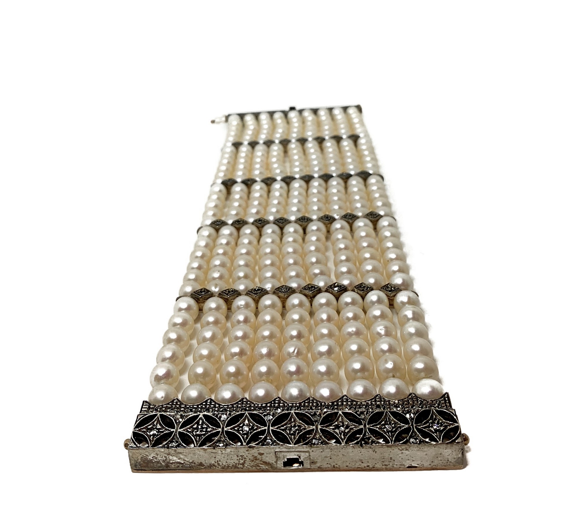 Bracciale con perle, 20° Secolo lunghezza 20 cm, larghezza 6 cm Fascia composta da nove fili di perle coltivate con susta e distanziatori in oro rosso, argento e scagliette.Fascia composta da nove fili di perle coltivate con susta e distanziatori in oro rosso, argento e scagliette.