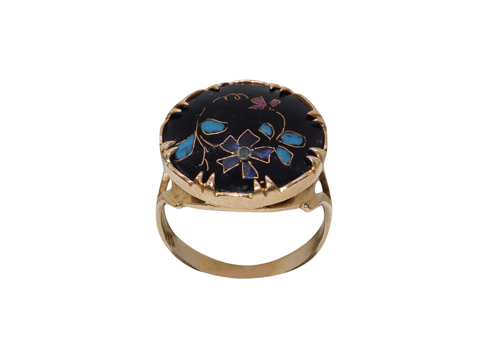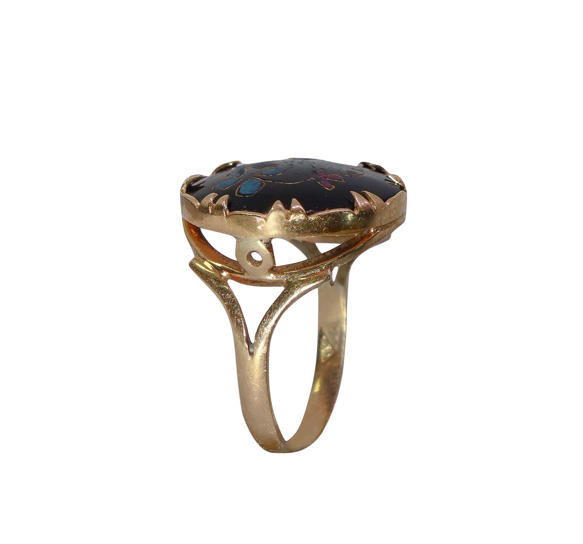 Anello in oro giallo 18 kt ,onice ed intarsi floreali in pietre dure