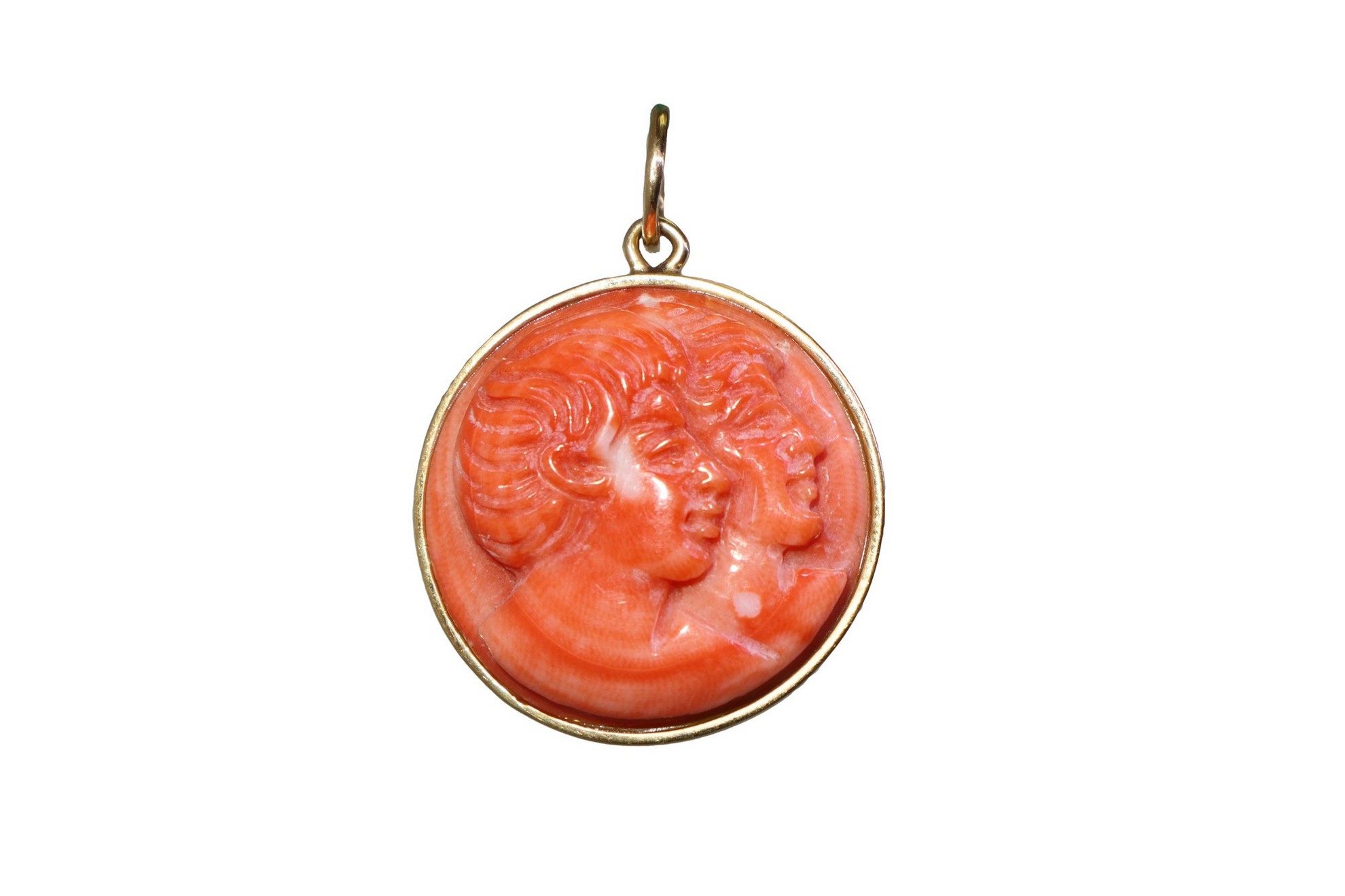 Ciondolo in corallo Con cornice in oro raffigurante due volti.Con cornice in oro raffigurante due volti.