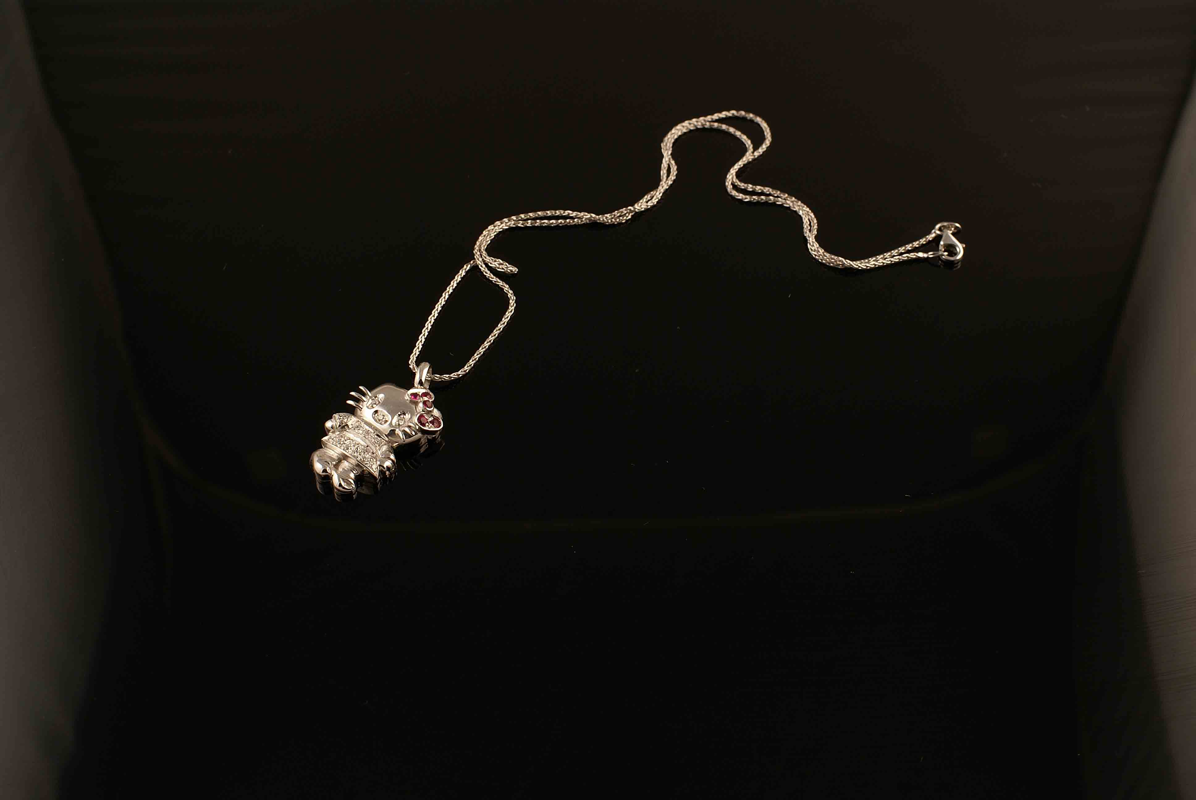 Pendente "Hello Kitty", in oro bianco 18kt con incastonati diamanti taglio brillante per 0,25 punti circa e rubini tondi, completo di catenina, gr. 11,7.