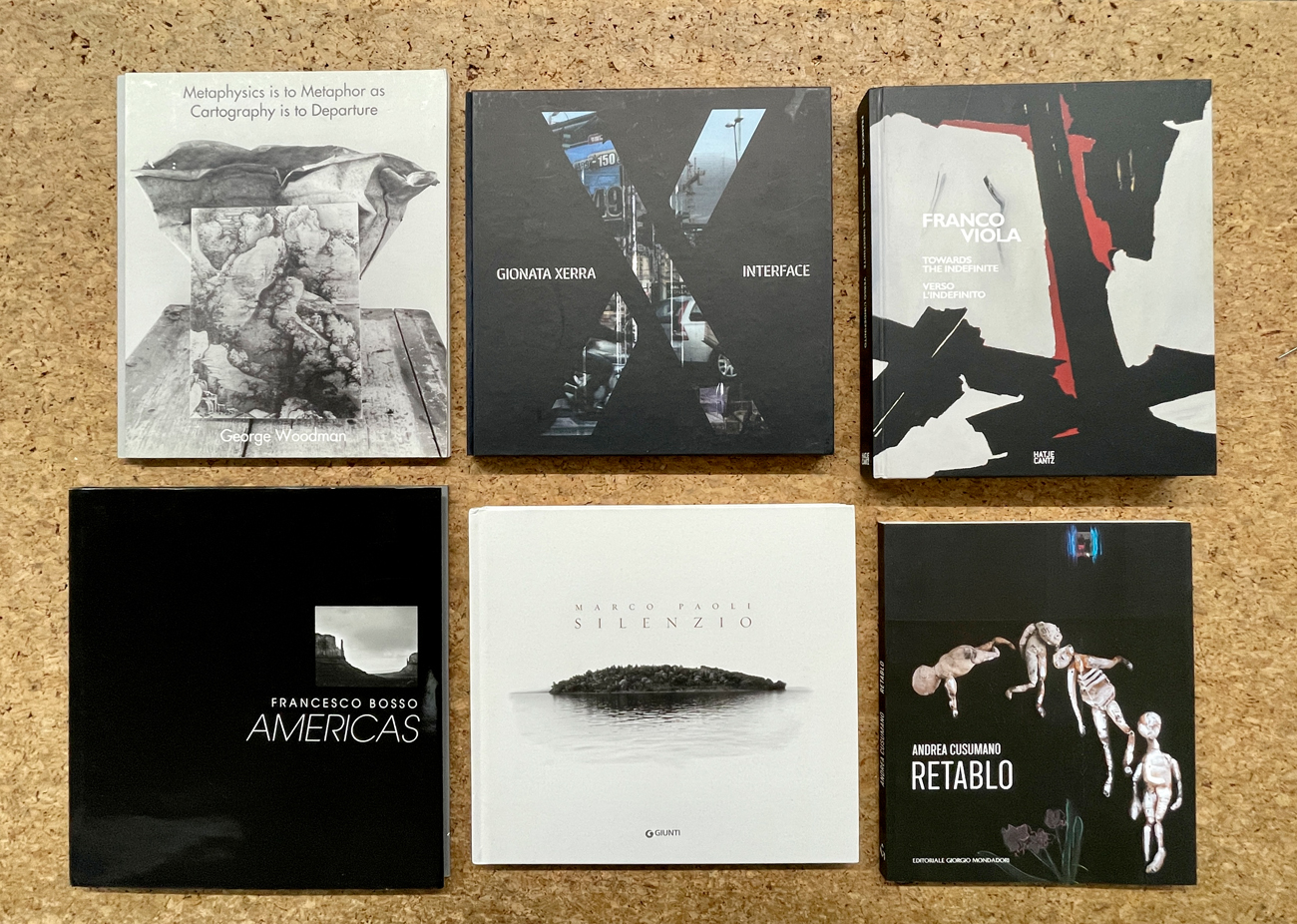 Lotto unico composto da 6 cataloghi riccamente illustrati editi in occasione di esposizioni personali dei seguenti artisti: George Woodman, Gionata Xerra, Franco Viola, Andrea Cusumano, Marco Paoli, Francesco Bosso