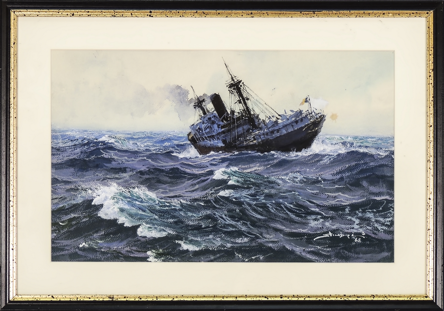 DIMITRIE STIUBEI (1901-1989) Nave a vapore - Steamship tempera su cartoncino - tempera on cardboard firmato e datato '68, in cornice cm 30x47