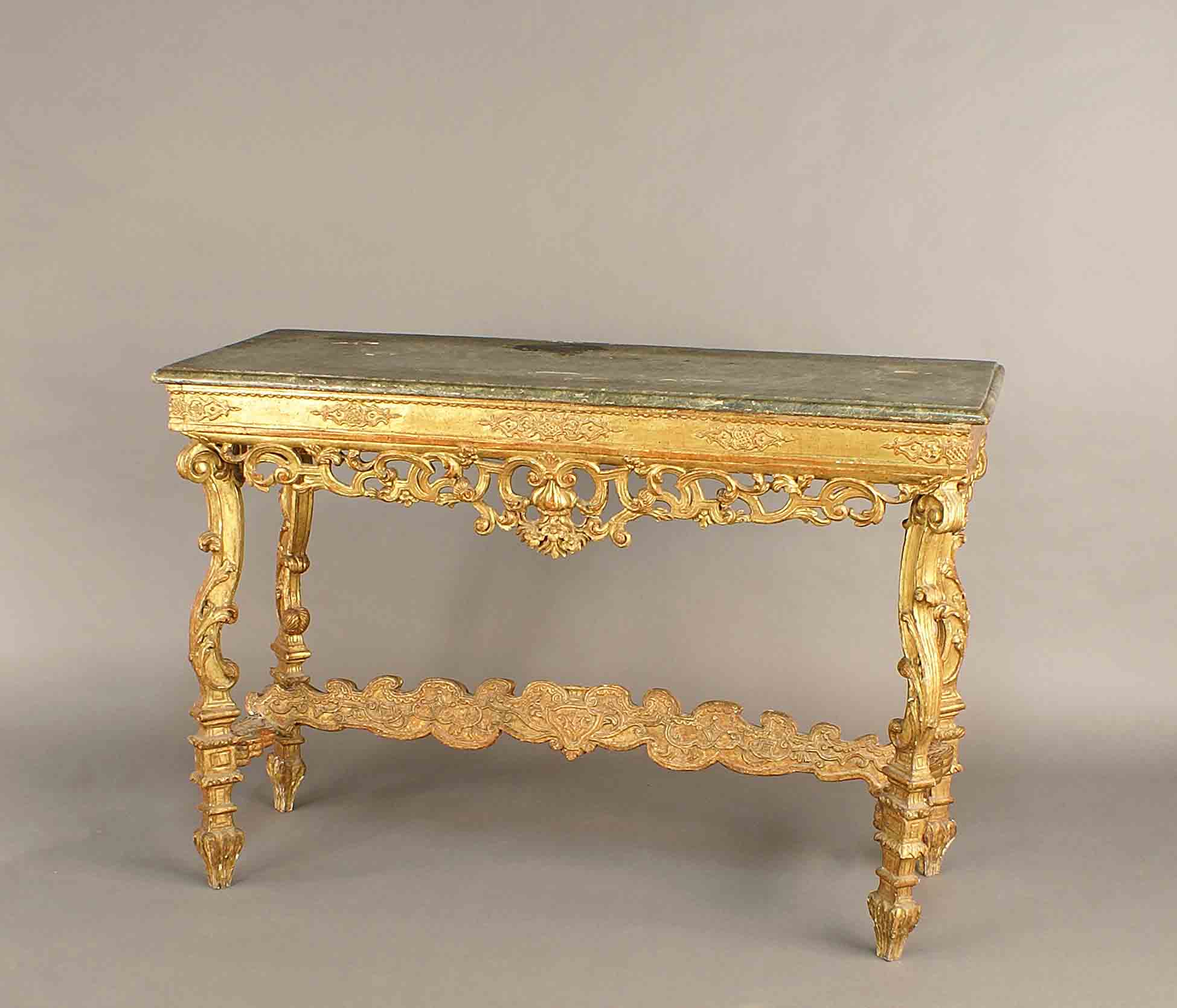 Console in legno dorato ed intagliato, piano rettangolare dipinto a simulare...