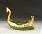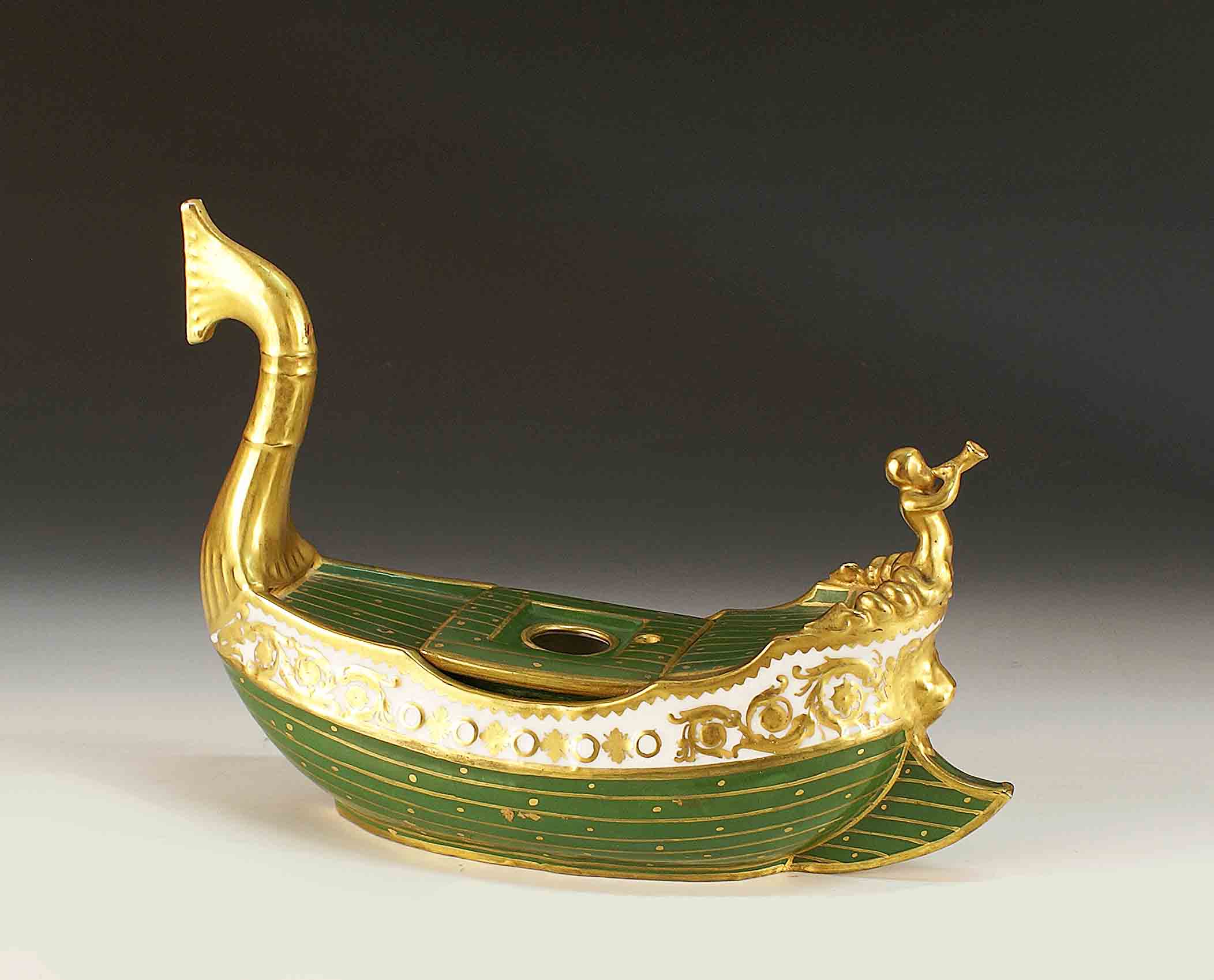 Particolare calamaio a motivo di navicella in porcellana dipinta e parzialmente dorata, Sevres, vecchia manifattura, cm. 20x27x10.
