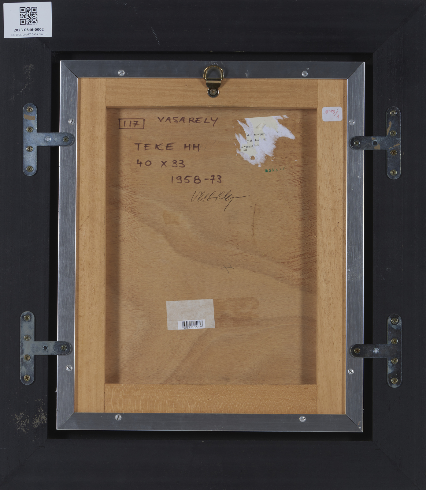 VASARELY VICTOR (1906 - 1997) Teke-HH. Olio su tavola. Cm 33,00 x 40,00. 1958-73. Firma in basso al centro. Al retro titolo, firma e anno. Opera archiviata presso l'Archivio Vasarely, Aix en Provance, come da documentazione fotografica riportante la firma di Pierre Vasarely.