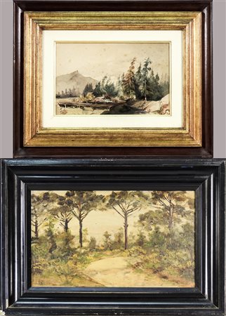 DUE PAESAGGI - TWO LANDSCAPES acquerello su carta e olio su tavoletta - watercolour on paper and oil on panel, in cornice, difetti cm 16x25 e cm 17x28