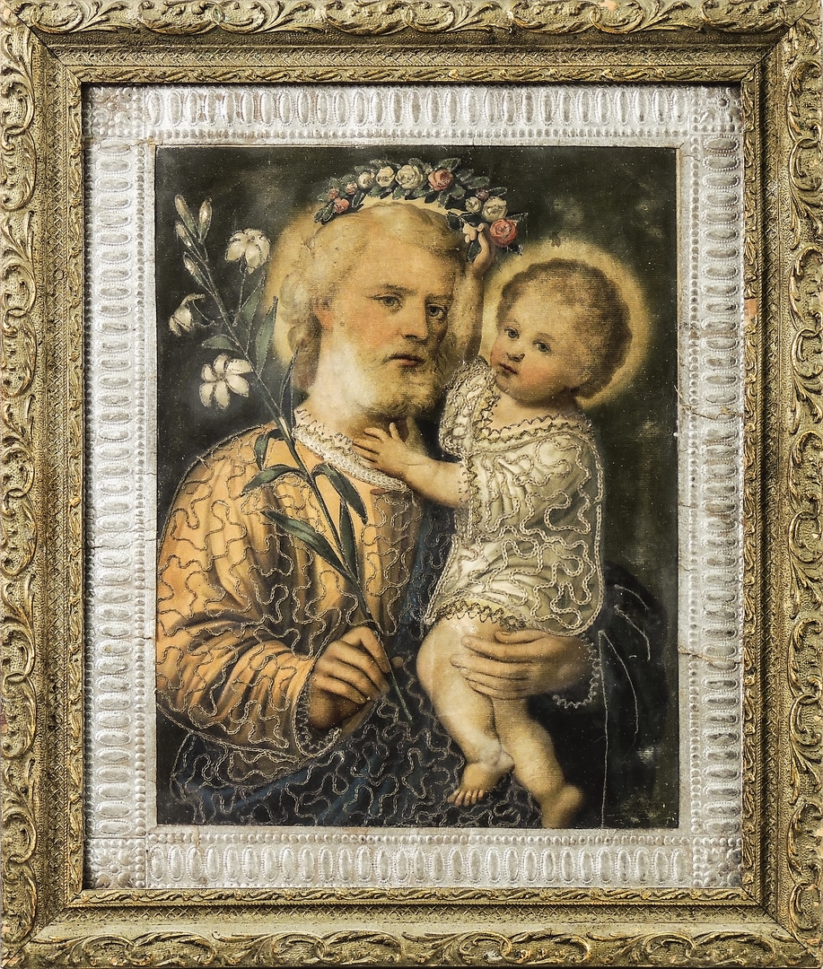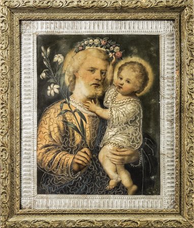 SAN GIUSEPPE CON BAMBINO - SAINT JOSEPH WITH CHILD XIX secolo - 19th century oleografia su tela con ricami - oleograph on canvas with embroidery, in cornice in pastiglia dorata coeva cm 48x39