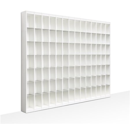 Large custom bookcase. Milan, 1970s. Wood, white Abet laminate, anodized aluminium. (324x255x25 cm.) (slight defects)