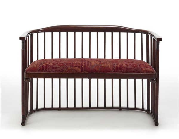 Divanetto. Austria, 1906ca. Legno di faggio curvato al vapore verniciato, seduta rivestita in tessuto damascato rosso. Marcato a fuoco. (cm 121x79x50) (lievi difetti e restauri)