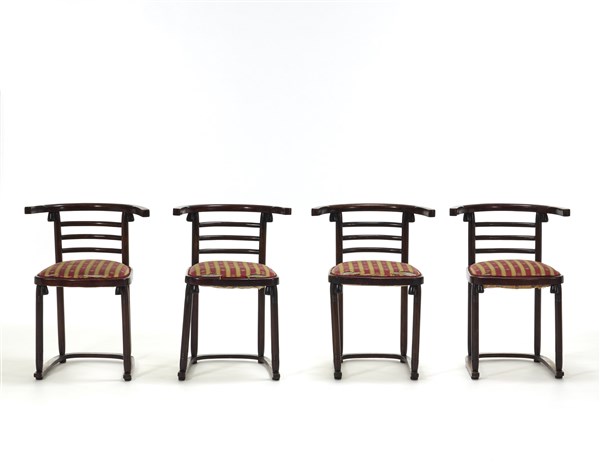 Gruppo di quattro sedie a pozzetto modello "728 Fledermaus". Esecuzione Jacob & Josef Kohn, Austria, 1906ca. Legno di faggio curvato al vapore e tinto mogano, seduta rivestita in tessuto a righe. (cm 54x74x48) (lievi difetti)