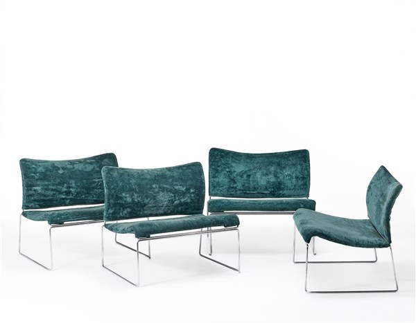 Gruppo di quattro poltroncine modello "Saghi". Produzione Gavina, San Lazzaro di Savena, 1968. Struttura in acciaio, rivestimento della seduta e dello schienale in velluto. (cm 75x67x59)