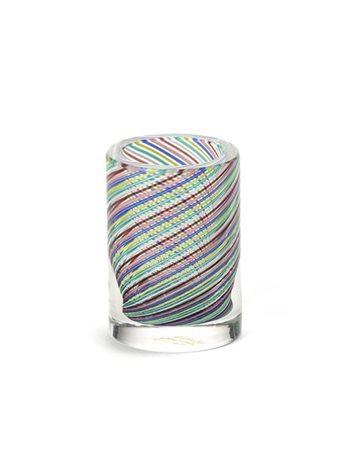Piccolo vaso in vetro soffiato cristallo con decoro a fili multicolore. Murano, anni '50. Firmato all'acido "venini murano ITALIA". (h cm 7,5; d cm 5,2) (lievi difetti)