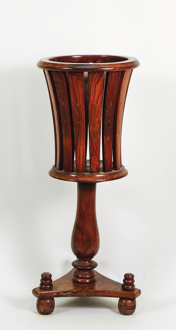 corpo svasato a ringhiera, sostegno tornito su base triangolare e tre piedini a palla schiacciata