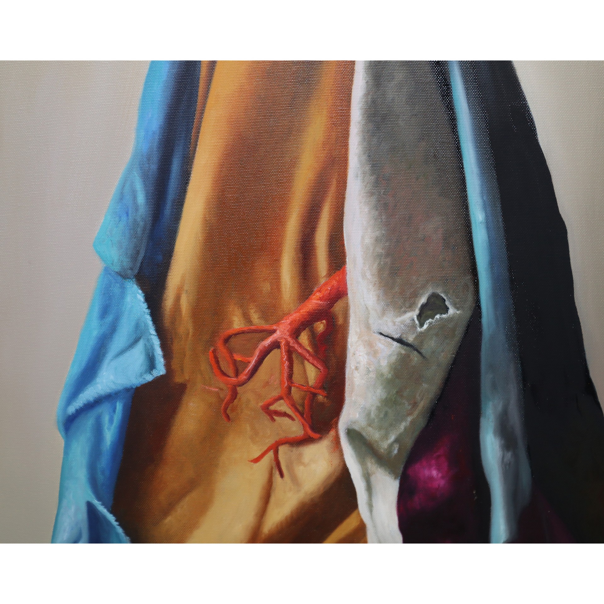 Antonio Sciacca (Catania 1957) - Panneggi, corallo ed uovo cm 100 x 70 Olio su tela Firmato sul fronte ed al retro.
