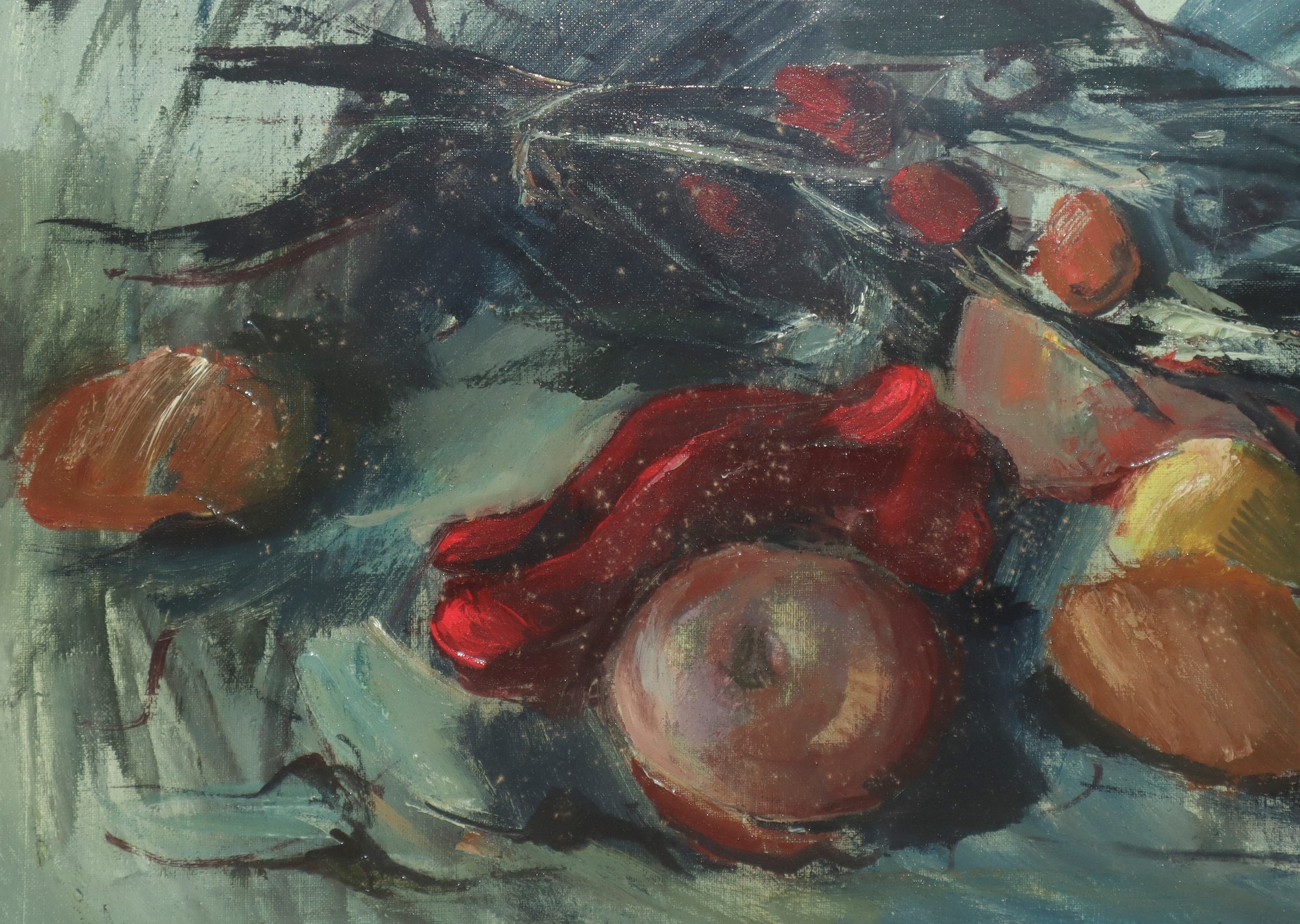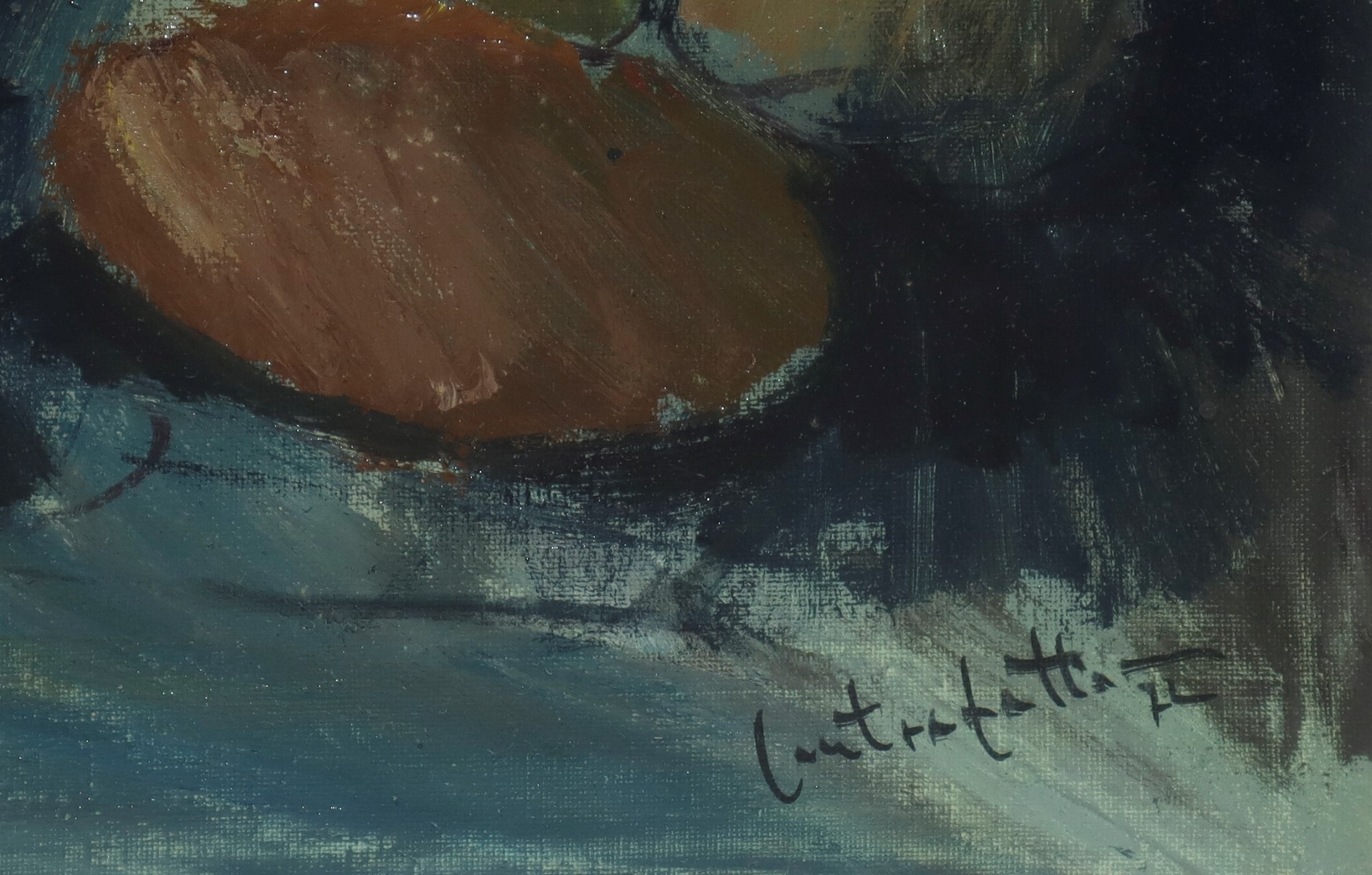 Francesco Contrafatto (Catania 1928-Catania 2015) - Natura morta di frutta con pane, 1972 cm 40 x 50, in cornice 61 x 71 olio su tela Firmato in basso a destra.
