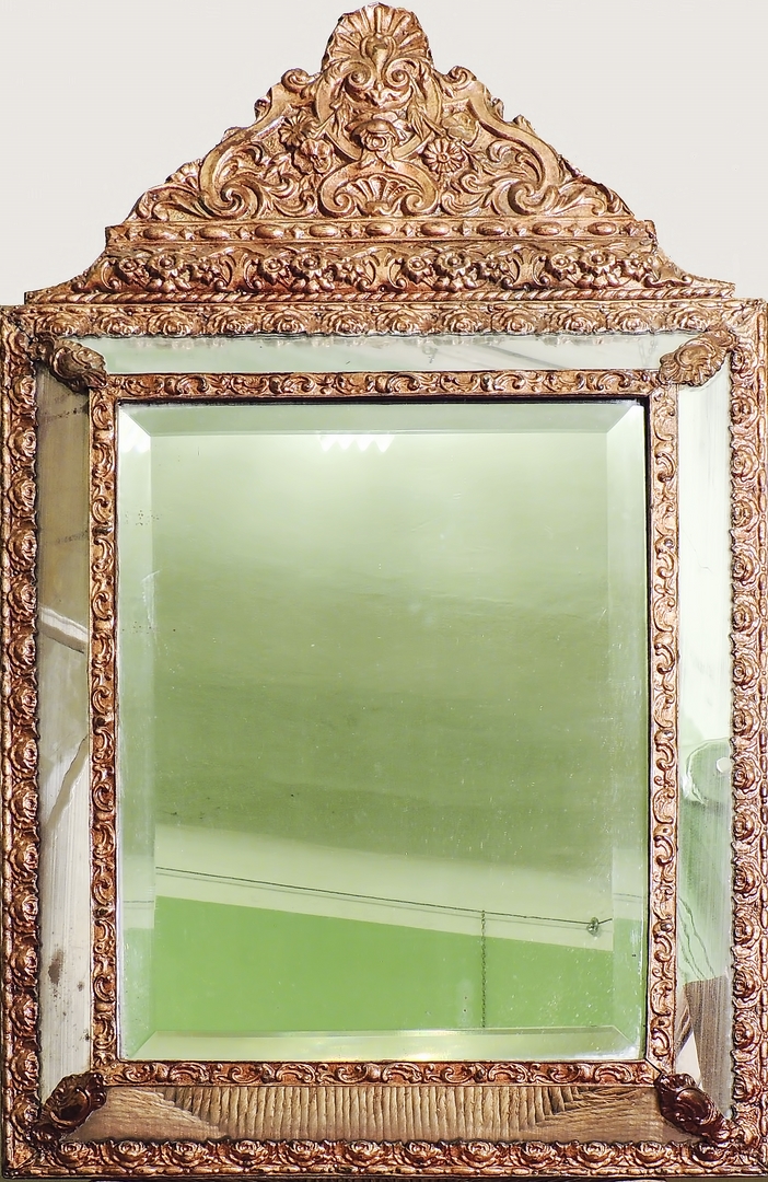 SPECCHIERA IN LEGNO RIVESTITO IN TÔLE DORATA - GILDED TÔLE MIRROR sbalzata con motivi floreali, alta cimasa decorata con volute e girali cm 98x57,5