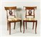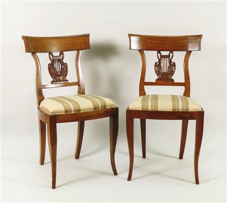SERIE DI CINQUE SEDIE IN NOCE - FIVE WALNUT CHAIRS Toscana, XIX secolo - Tuscany, 19th Century cartelle a lira, gambe anteriori mosse, le posteriori a sciabola, seduta imbottita e rivestita in tessuto rigato