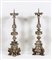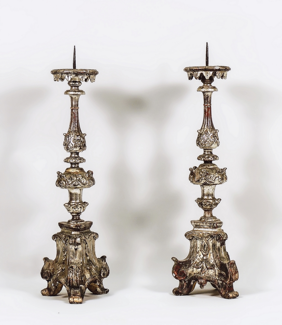 COPPIA DI TORCIERE IN LEGNO INTAGLIATO E ARGENTATO - PAIR OF CARVED AND SILVERED WOOD PRICKETS Toscana, XIX secolo - Tuscany, 19th Century fusto a balaustro decoro a volute e foglie, base poggiante su tre piedi a ricciolo h cm 69