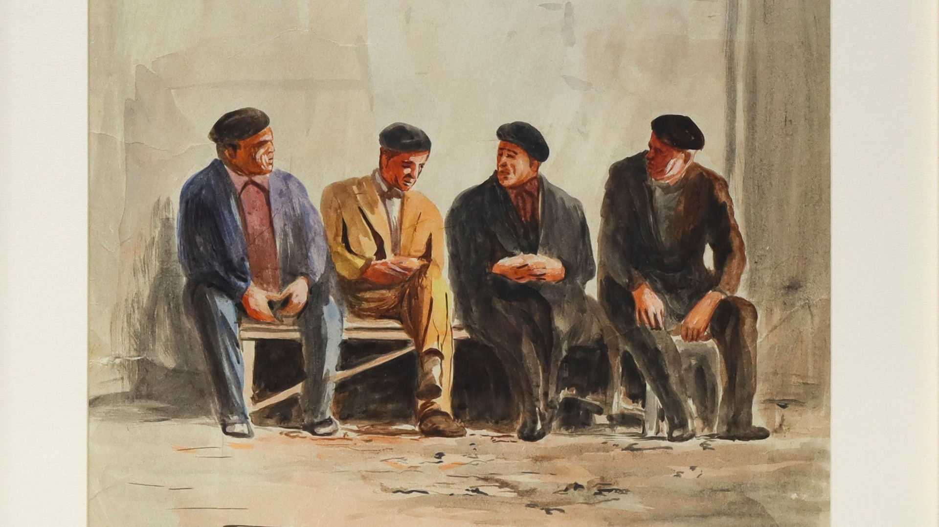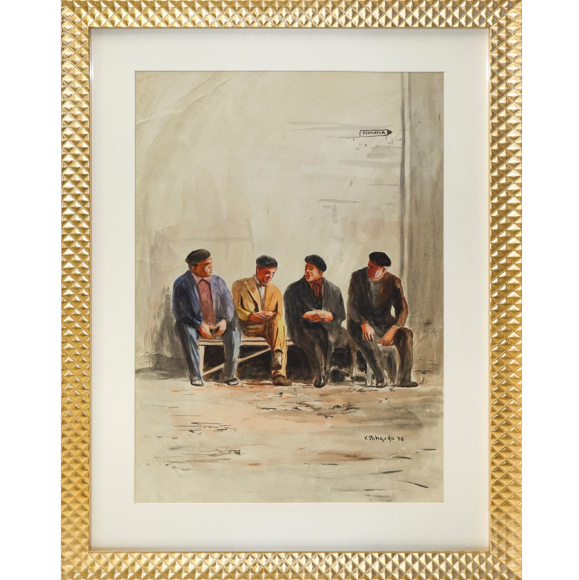 Vittorio Ribaudo (Palermo 1937) - Signori in sala d'attesa, 1978 cm 46 x 33 , in cornice 61 x 48 Tecnica mista Firmato e datato in basso a destra.