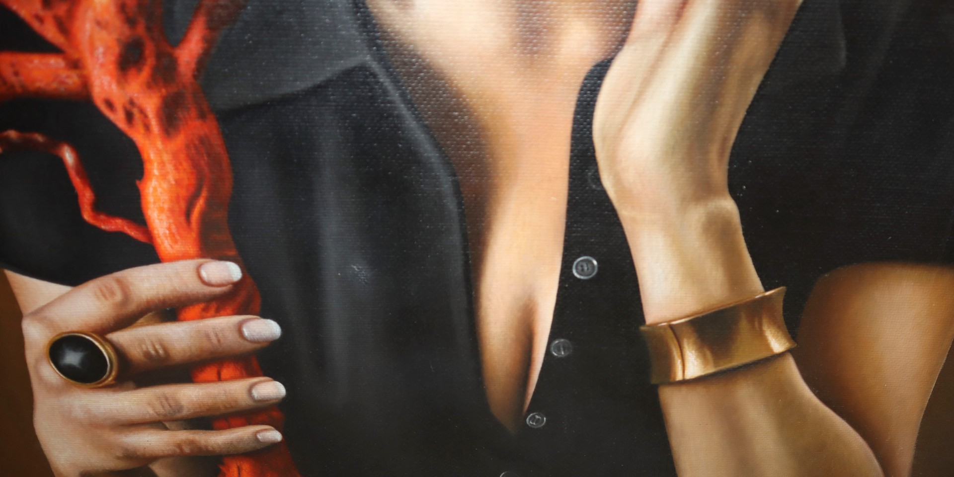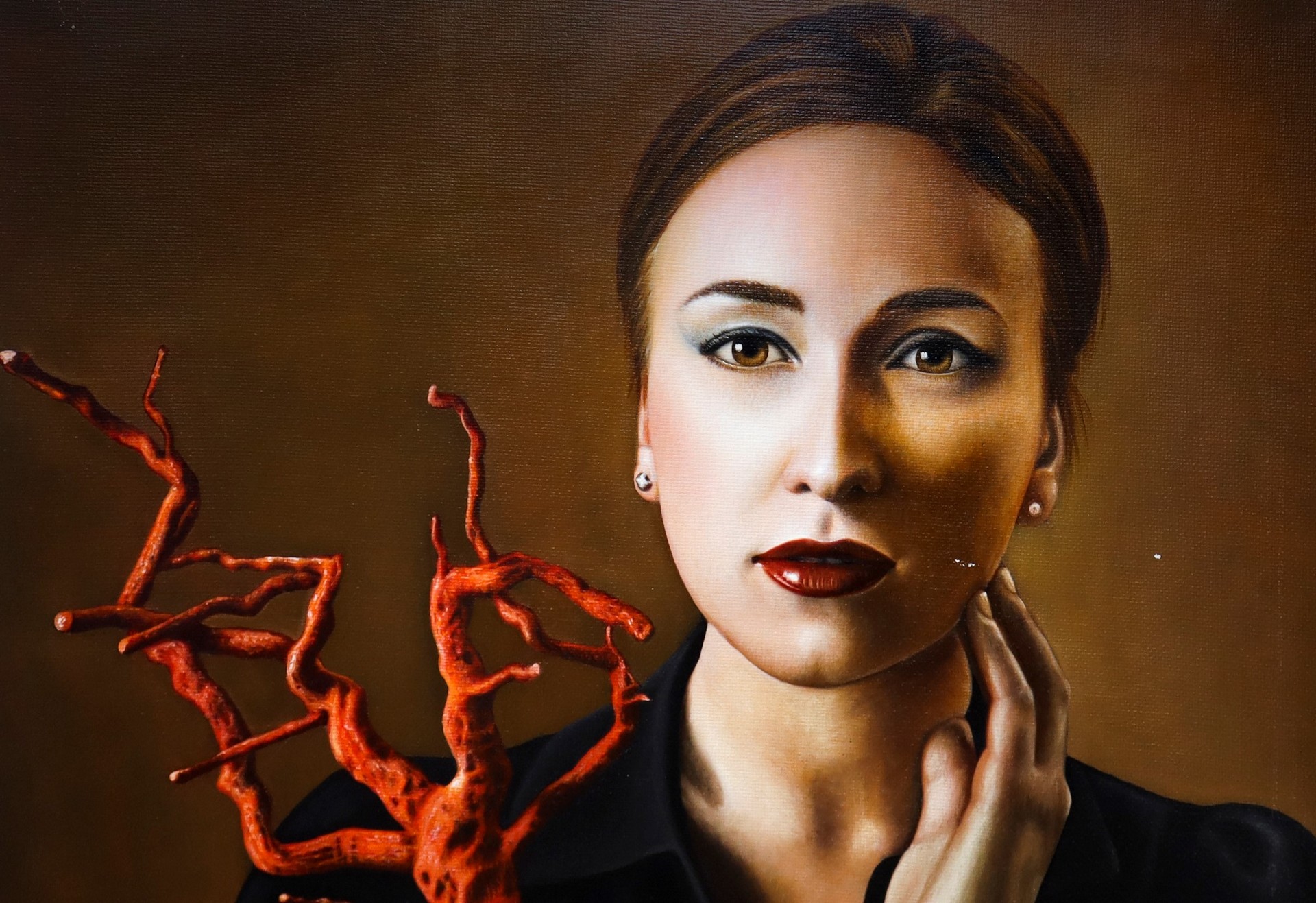 Antonio Sciacca (Catania 1957) - Donna con ramo di corallo cm 117 x 90 Olio su tela Firma su retro, senza cornice.