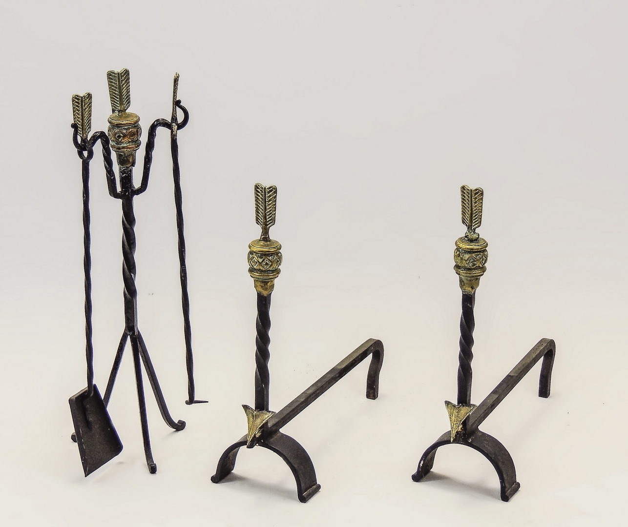 SET DA CAMINO IN FERRO BATTUTO E BRONZO - WROUGHT-IRON AND BRONZE FIREPKACE TOOL decorati con motivo di frecce di gusto impero (5)