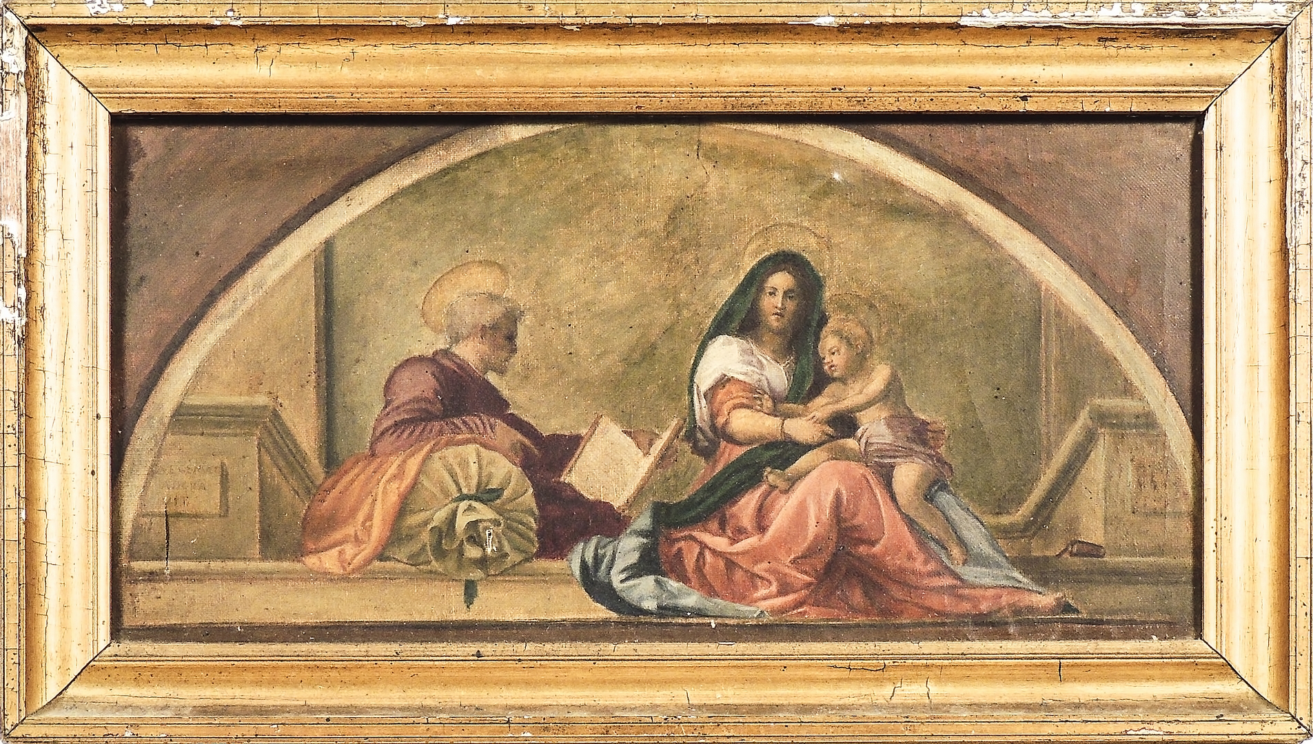 LUIGI FANANI La Madonna del Sacco - Madonna olio su tela - oil on canvas, copia dall'affresco di Andrea del Sarto, al verso reca iscrizione, in cornice, difetti cm 27x54