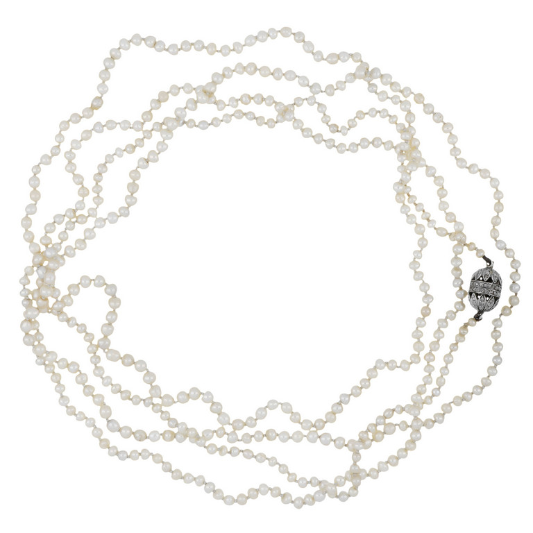 Lunga collana di perle naturali e chiusura a barilotto tempestata di diamanti di vecchio taglio a tutto tondo realizzata in platino.