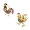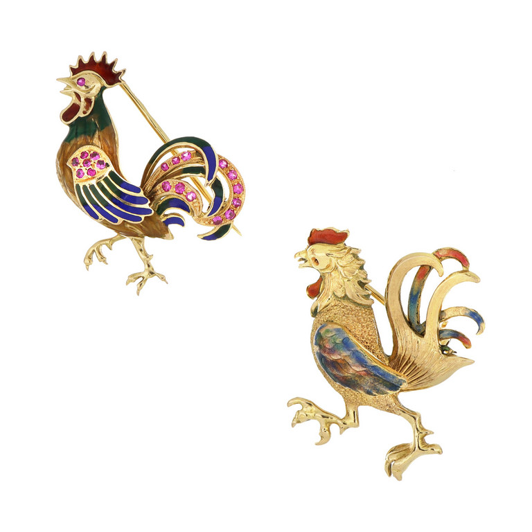 Lotto composto di due spille a forma di gallo in oro giallo con smalti policromi piccoli rubini sintetici.