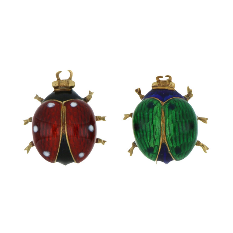 Lotto composto di due spillini in oro giallo e smalti policromi a forma di coccinelle.