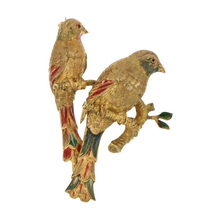 Spillino in oro giallo a forma di due uccellini sul ramo smalti policromi.