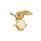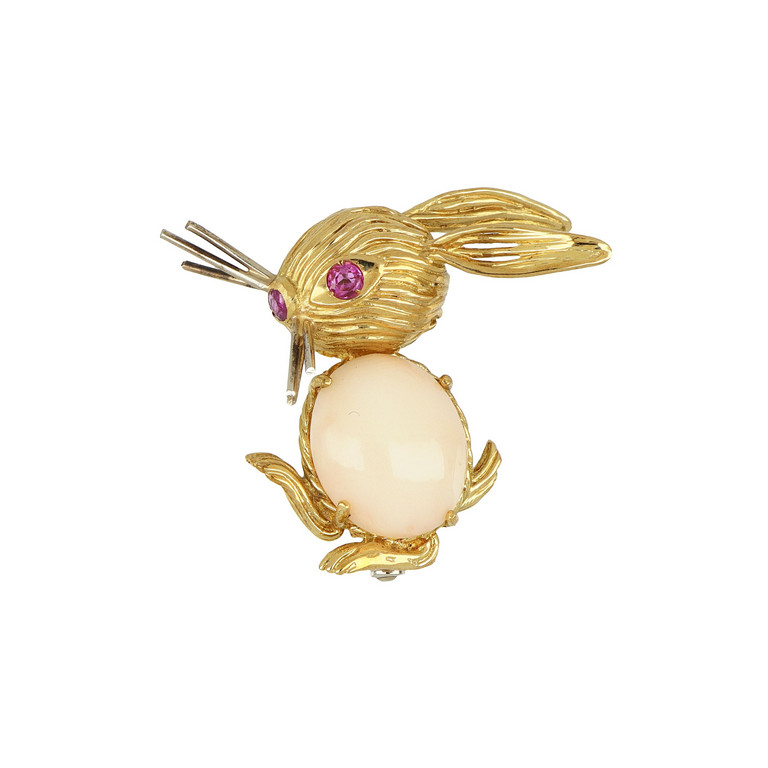 Spilla in oro giallo corallo e piccoli rubini a forma di coniglietto.